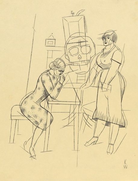 Curator: This delicate pen sketch, entitled "Companionship" by Alekos Kontopoulos, presents an intimate, almost melancholic scene. What are your first impressions? Editor: Immediately, I see a visual echo of past relationships—the symbols are very dense. The figure on the right seems detached, almost confronting the viewer, while the other is lost in contemplation. The candlestick separating them feels like a significant barrier. Curator: I am particularly drawn to the artist’s process here. The use of pen allows for such expressive linework, conveying texture and shadow with a wonderful economy of means. Consider the fringe on the table. The texture and volume are captivating. Editor: Absolutely, and notice the table itself—almost an altar. It grounds them together despite the woman's physical and perhaps emotional distance. The candelabra itself, while dividing them, also represents memory, rituals shared or now disrupted. The patterning of her robe further serves to project an almost spiritual or romantic quality. Curator: It’s intriguing to think about the social context as well. Was Kontopoulos depicting a common domestic scene, perhaps hinting at the silent labor within it? Or did he seek to critique bourgeois relationships through its presentation? Editor: That's interesting, I interpret it more as a timeless representation of human connection and disconnection, transcending a specific time or place. It is a meditation on how two people can share space yet occupy entirely different emotional worlds, as evoked by very powerful iconography. Curator: A compelling point. Perhaps the very nature of "companionship" itself, as revealed through a simple, direct drawing technique. The immediate availability of pen on paper democratizes its creation while still leaving the potential for expressive outcomes. Editor: Precisely, that tension elevates this unassuming work beyond the purely aesthetic, and prompts us to think of art not just as craft or visual representation, but rather, of memory, ritual and the visual embodiment of those aspects in art. Curator: An illuminating perspective, and an insight into Kontopoulos’ choice to record these dynamics using the simplest, most ubiquitous means. It forces one to think deeply about value, artistic practice, and connection. Editor: It highlights, for me, how even seemingly simple visual components work together to evoke potent meanings which resonate within us beyond language, and maybe that in itself offers us hope for, indeed, companionship.