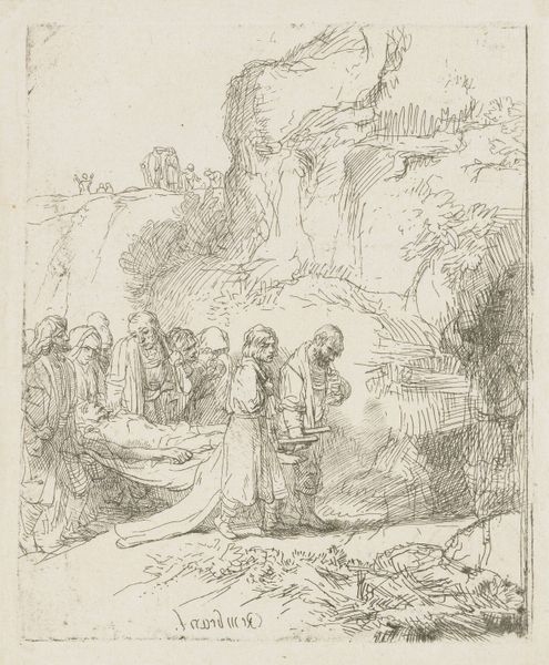 Editor: This is Rembrandt van Rijn's etching, "Christ's Body Carried to the Tomb." I'm struck by how raw the etched lines feel, especially given the somber subject. What can you tell me about it? Curator: Note how Rembrandt's use of etching, a process involving acid and metal plates, democratized image production. Consider too the social context: prints like these circulated widely, becoming commodities for a growing art market, impacting religious interpretation through mass consumption. What does this suggest to you? Editor: It really makes you think about who had access to the image and how that changed its meaning. Thanks! Curator: Indeed. The material process and its social reach redefined art's role in society.