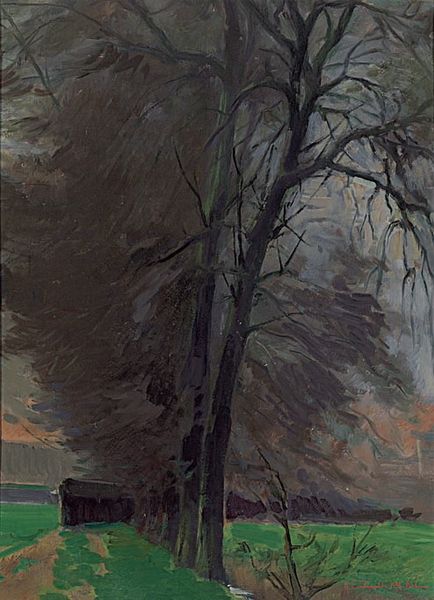 Curator: This is "Landscape Motif" by Olga Boznanska, painted around 1890. It’s a fantastic example of her post-impressionist, plein-air work. Editor: Immediately, I’m struck by the muted palette and the thick impasto. There's a certain earthiness and weight to the scene, almost tactile in its application. Curator: Boznanska, working in a period of significant social and artistic change, provides us with a lens to examine evolving perceptions of landscape. This work subtly challenges traditional, romanticized depictions of nature, suggesting a move toward a more modern, subjective experience of the environment. Editor: Indeed. The visible brushstrokes and the materiality of the oil paint call attention to the process of creating the landscape. It feels less about an idealized scene and more about the very act of observing and translating it through labor. Look at how she layers the paint to build texture and volume, drawing our focus to the physical making of the image. Curator: What I find compelling is how Boznanska manages to capture a sense of both immediacy and timelessness. The hazy atmosphere evokes a specific moment, yet the subject—the enduring landscape—transcends temporal boundaries. It also intersects with debates on female agency and visibility within the art world, especially given her contemporary struggles as a female artist. Editor: I agree. The rough, almost unfinished quality emphasizes the inherent imperfections of working "en plein air"—confronting the uncontrollable elements, heat, and fleeting light. In a way, the materiality and the technique work in harmony to reveal that engagement and negotiation, moving us away from an artist's singular vision and connecting the artwork to tangible circumstances of its creation. Curator: Exactly. Thinking about those struggles allows us to understand that this is a deeply personal reflection, rather than just a simple landscape rendering. Editor: Right. This piece certainly exemplifies how focusing on materiality can uncover nuanced perspectives that complicate the familiar stories that we tell. Thank you. Curator: A most fruitful engagement, indeed.
