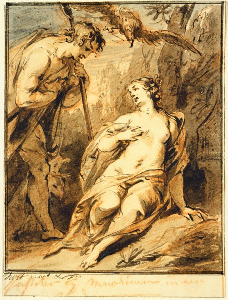 Editor: This is "Mars, Venus and Cupid," painted in 1757 by Giovanni Domenico Tiepolo. It's an oil painting that features these rather imposing figures floating on what appear to be clouds. It has a very airy, ethereal feel. How would you interpret this work? Curator: Well, putting it within its historical context, Tiepolo was working in an era when the aristocracy's taste for mythologies provided a ready market for these sorts of allegorical paintings. But look at how Mars, the god of war, is portrayed: he appears almost languid, defeated by Venus. Is Tiepolo perhaps offering a subtle commentary on the declining martial power of the Venetian Republic, replaced by the soft allure of pleasure and leisure represented by Venus? Editor: So, it’s less about the figures themselves and more about what they represent within Venetian society at the time? Curator: Exactly. The placement of such images mattered; their location shaped their meanings. The airy lightness, characteristic of the Rococo style, speaks to a kind of decadence. Where do you think such a painting would likely have been displayed? Editor: Maybe in a private villa, meant to impress guests? Curator: Precisely! It reinforces a certain worldview, doesn’t it? It’s meant to portray the patron as refined and learned, someone who appreciates these allusions to classical mythology, whilst also maybe nodding at a certain cultural weariness of war and valor. Editor: That's fascinating! I hadn't considered the role of display in shaping our understanding. Curator: Understanding art is often about understanding the social function it performs. That’s one of the many lessons I continue to learn when viewing artworks, from those by Tiepolo, or later works.
