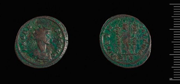 Curator: Here we have a Follis of Maximian I, crafted in Rome. Editor: The patina is striking. It almost obscures the imagery, imbuing the piece with a sense of submerged history. Curator: Indeed. It is a testament to the emperor's image and power. Note the laurel wreath, a symbol of victory. Editor: And on the reverse, we see a figure holding scales—a direct representation of justice and Roman law. The careful articulation of those scales is impressive. Curator: The coin served not only as currency but as propaganda, embedding the emperor's values in the daily lives of people across the empire. Editor: The weathered surface belies the coin's original crisp design and ideological weight. Even in decay, it conveys authority. Curator: A small object, yet it carries the weight of Roman imperial ambition and the legacy of Maximian. Editor: It's remarkable how the piece's intrinsic form resonates with its cultural significance.