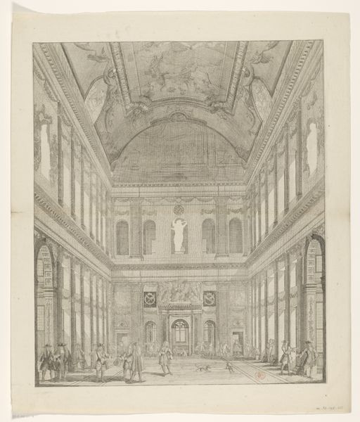 Jan Goeree created this rendering of the Westerkerk's interior in Amsterdam using etching. The structure, rendered in monochrome, demonstrates a mastery of perspective, drawing the eye deep into the church's nave toward the east. Goeree’s composition balances the architectural grandeur with a human element. The linear precision in the vaulted ceilings and towering columns creates a sense of awe, while the small figures placed throughout the scene offer a sense of scale and relatable human presence. The tiled floor, meticulously rendered, converges towards the horizon, reinforcing the depth of the space. The etching technique itself—with its network of fine lines—contributes to the play of light and shadow, enhancing the texture and volume of the architectural forms. The use of line is not merely descriptive; it’s expressive, creating a visual rhythm that echoes the church's own structural harmony. The building invites a contemplation of space, perspective, and the interplay between the monumental and the intimate.