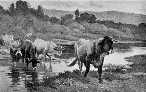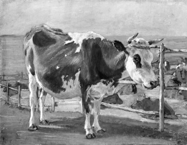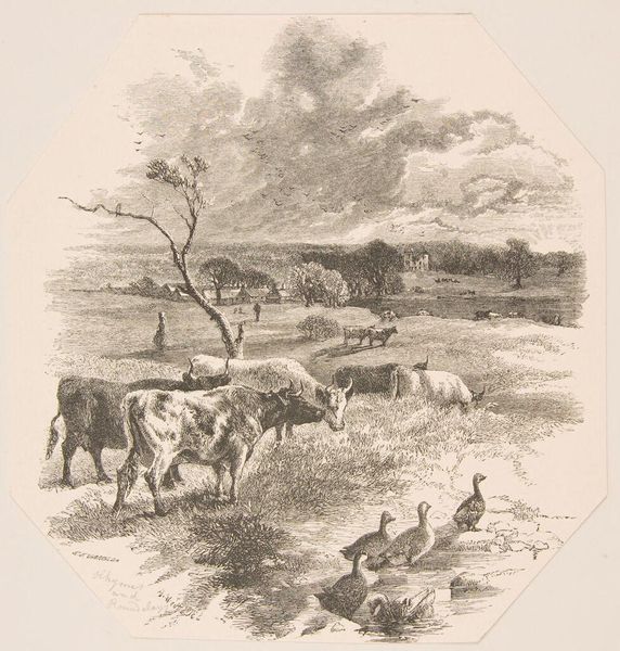 Editor: So, this is "Jerseykøer" by Peter Hansen, from 1917. It's a painting done in charcoal. The scene of cows in a field, rendered in monochrome, evokes a feeling of serenity and pastoral life. It’s very dreamlike. What do you see in this piece? Curator: I see more than just cows; I see symbols of abundance, nature, and a connection to a simpler time. The monochromatic palette almost feels like a memory. Note how charcoal as a medium can speak to temporality. Consider what the artist’s choice of depicting Jersey cows, specifically, might signify to a Danish audience in 1917. What qualities might those animals have symbolized? Editor: That's an interesting question! I hadn't thought about the cows themselves carrying a specific meaning. Is it about the association with dairy production and rural prosperity? Curator: Precisely! The choice carries significant weight in understanding the artwork’s full meaning. These weren’t just any cows. And look at their positioning, relaxed. They appear contemplative almost. The pastoral setting provides a sense of timelessness, but within the historical context of World War I, doesn't the tranquility also speak volumes? Editor: Yes, it’s a very powerful contrast. The dark tones of the trees against the open field almost act as a warning or boundary. The artist makes us wonder what’s beyond the field. Curator: And this is why the artist's careful consideration of composition adds depth; beyond what’s plainly visible in the image. Editor: It’s fascinating how an ostensibly simple scene reveals so much complexity when you start to decode the imagery and its historical context. Curator: Indeed. It is the subtle symbols and imagery that weave cultural memory into visual form, sparking a deeper understanding.
