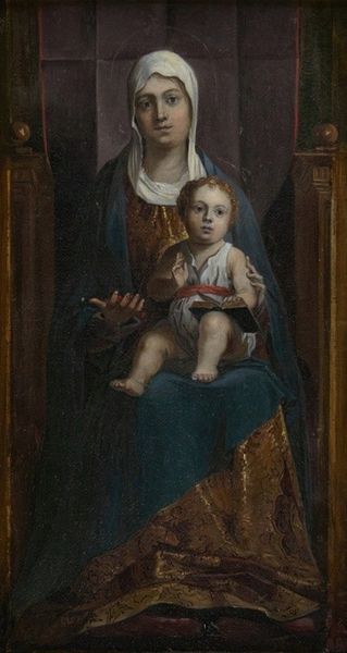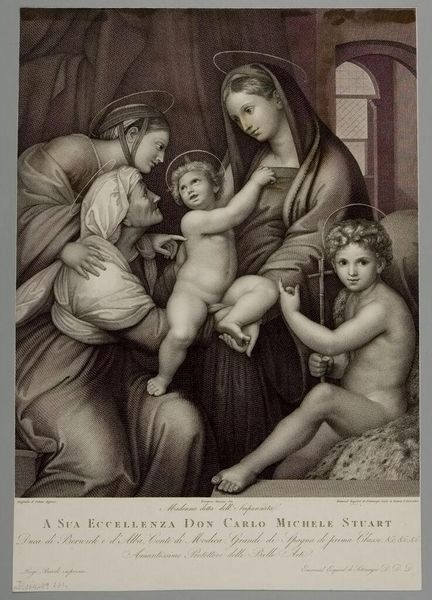 William Bouguereau created this painting, Madonna with Child and John the Baptist, using oil on canvas. The artist has masterfully employed the medium to create a photorealistic depiction of skin. Painted with incredible precision, the figures are arranged in a classical pyramidal composition reminiscent of Renaissance art. Bouguereau's technique involved layering thin glazes of oil paint to achieve a smooth, luminous surface, almost like porcelain. This approach demanded a high level of technical skill and countless hours of labor. The intense realism and attention to detail, typical of academic painting, required rigorous training and the suppression of any visible brushwork, an artistic skill attained through years of dedicated learning. By engaging with the tradition of painting religious subjects, Bouguereau participated in a market-driven system where technically skilled artists catered to the tastes of the bourgeoisie, a way of making that maintained a distinction between "high art" and craft.
