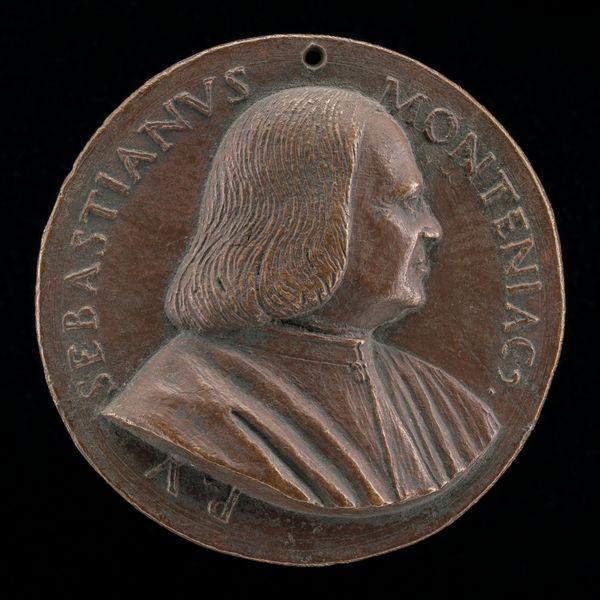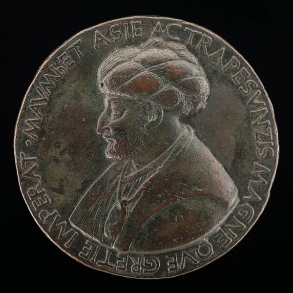 Curator: This striking bronze medal portrays Mehmed II, also known as Mehmed the Conqueror, Sultan of the Ottoman Empire, created circa 1480 by Gentile Bellini. Editor: Wow, look at that profile. I get a distinct sense of shrewdness, like he's always calculating his next move on a chessboard. Do you get that feeling too? It’s funny how metal can give off such vibes. Curator: Indeed. Bellini was actually commissioned by Mehmed himself, marking a fascinating intersection of cultures during the Renaissance. This piece offers a glimpse into the political and artistic dialogues between Venice and the Ottoman Empire. Editor: Commissioned! Think of being captured by a visiting artist… I imagine it like catching a glimpse of oneself, but translated, maybe skewed by perspective and... propaganda. I wonder if Mehmed felt seen? Or just... useful? Curator: It's likely a potent mix of both. Beyond aesthetics, the medal is an assertion of power and a diplomatic gesture. It reflects a specific moment where cross-cultural exchanges shaped identity and political strategy, influencing narratives of East and West. Editor: It does look strangely… contemporary somehow. I almost want to pick it up and use it as a giant, gloriously retro crypto coin! Its appeal is its ability to remind people that power is fleeting and that empires rise and crumble, leaving traces for us to question. It’s really humbling, isn't it? Curator: Absolutely, reflecting on the material culture helps reveal shifts of the time. We consider identity as it intertwines with empire, and hopefully walk away recognizing a deeper complexity. Editor: To view a portrait across time and space that shows us about ourselves, how wonderfully rare and beautiful. Thanks for revealing all that, friend!