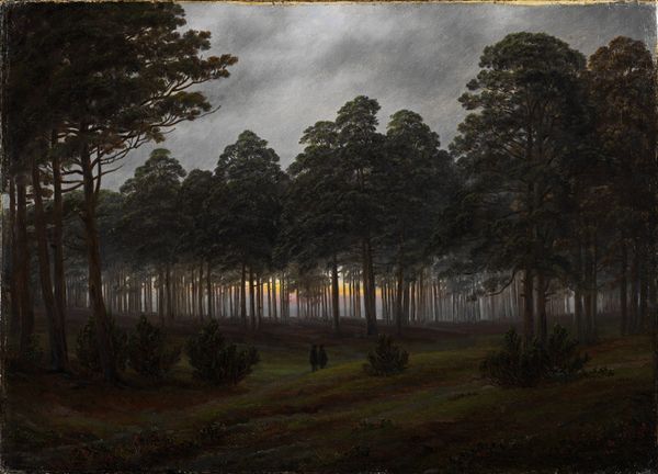 Editor: Standing before us is Hendrik Voogd’s "Italian landscape with umbrella pines," painted in 1807. The oil paint practically glows! The composition seems carefully arranged, but the overall effect is surprisingly serene. What draws your eye when you look at this piece? Curator: Primarily, the light. Notice how Voogd has meticulously rendered the diffusion of sunlight through the pines. Observe the careful gradation of light and shadow, creating a dynamic interplay between the verticality of the trees and the horizontality of the landscape. The manipulation of light isn't merely representational, but structural, defining form and space within the canvas. Editor: So, you're saying it’s not just about pretty sunlight? Curator: Precisely. It’s about how light operates as a compositional tool. The way he segments the image plane through the calculated use of light creates visual organization. Further, observe the tonal range; from the lightest highlights to the darkest shadows, all contribute to a unified and coherent visual experience. How do you interpret the relationship between foreground and background, given this tonal structure? Editor: I see the light helps separate the figures in the foreground, making them more prominent despite their small size. The soft focus on the distant landscape really pushes it back. Curator: Correct. This recession establishes depth, utilizing aerial perspective to subtly guide the viewer's eye. Beyond mere representation, how do these techniques speak to a formal understanding of space within the painting? Editor: That makes the composition really intentional. I originally saw just a pleasant scene, but there is so much thought about light, tonal arrangement, and visual layers. Curator: Indeed. Voogd demonstrates a profound engagement with formal properties beyond mimetic representation. Studying such a painting prompts one to look deeper into formal choices than immediately meets the eye.