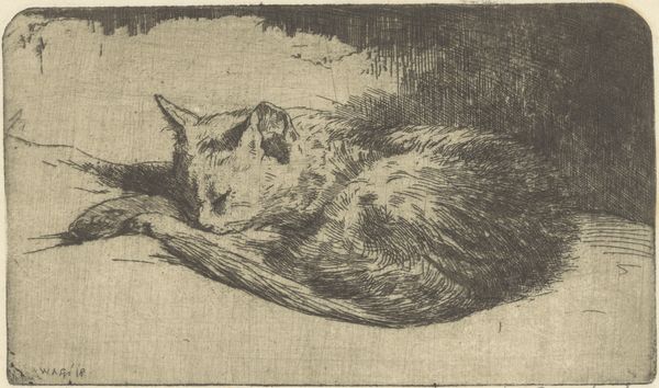 Editor: This is "Sleeping Lynx" by Christian Kongstad Petersen, made in 1912. It’s an ink drawing, and it feels almost like a quick sketch, but it really captures the weight and texture of the animal’s fur. How do you see its composition working? Curator: Note the strategic use of line weight. Petersen employs thicker, more emphatic strokes to define the contours of the lynx’s face and ears, creating a clear visual hierarchy. This bold linework contrasts with the finer, more delicate strokes used to depict the fur, resulting in a dynamic interplay of textures and a palpable sense of depth. Editor: So it’s all about the contrast? Curator: Precisely. Consider how the stark black lines are set against the toned paper. This creates a simplified yet effective tonal range, accentuating the forms and adding visual interest. The texture of the paper itself becomes integral to the overall composition, further emphasizing the materiality of the drawing. Note that a tight framing box amplifies the inherent tension within. Editor: I see what you mean about the texture of the paper now that you point it out! Is there a significance to that frame, then? Curator: Perhaps; though whether the frame exists within or is inherent to the support is another question entirely! Regardless, notice also how the expressionistic use of line defies strict representational accuracy; Petersen’s primary interest seemingly lies in conveying essence, rather than likeness. Editor: That makes sense. I hadn't really thought about how much the line work contributes to the overall feeling. Curator: Indeed! What at first glance appears simple upon further investigation is richly complicated. Editor: That's a great point. It's so interesting how much you can unpack from something that looks so spontaneous!