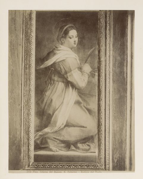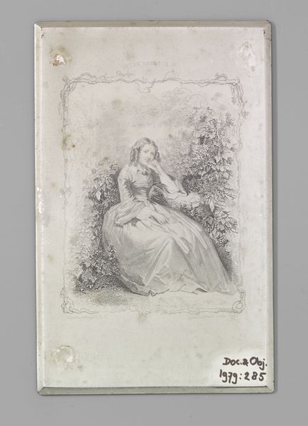 Curator: Here we have "Dame voor gordijn en balustrade", created between 1852 and 1898 by Leopold Löwenstam. It's an engraving, a type of print. I see in this artwork the distinct marks of Romanticism. Editor: My first thought? Drama! She's clutching her throat, there's a fallen rose. Is she about to faint? This looks like a scene ripped straight from an opera. I bet the curtain behind her is velvet. Curator: It definitely carries that weight! Romanticism thrived on intense emotion, dramatic narratives, and an embrace of beauty that was often melancholic. Her pose, the way the light falls – it's all meticulously arranged to evoke a particular feeling. What is less obvious, maybe, is the weight this pose might have in art historical traditions, drawing on depictions of female hysteria, even the Virgin Mary fainting during the Passion. Editor: Ooh, I love that! It’s like she's playing a role, almost like a photograph meant to imitate painting—an actor performing in a very studied way, for sure, but performing nonetheless! And I suppose there's something melancholic about that inherent artificiality too. You know, you can almost hear the music swelling... or maybe that's just my imagination running wild! Curator: I'd argue it is not solely imagination. Consider the use of academic art practices to achieve this style and presentation, to generate an emotional reaction. These references help to show continuities in visual symbols across history. Academic art tried to portray stories and beauty ideals according to specific historical or even psychological tropes that may feel melodramatic now. Editor: Right. Maybe this moment isn't quite so spontaneous, but it does hit that romantic nerve. So, whether it’s heartfelt emotion or a calculated theatrical gesture... or perhaps both at once!... I’m here for it. And in the end I guess all those older depictions come down to performative emotion. Curator: Well put. Looking at it again, that controlled passion somehow makes it even more fascinating. Editor: Exactly. There is something quite moving here after all!