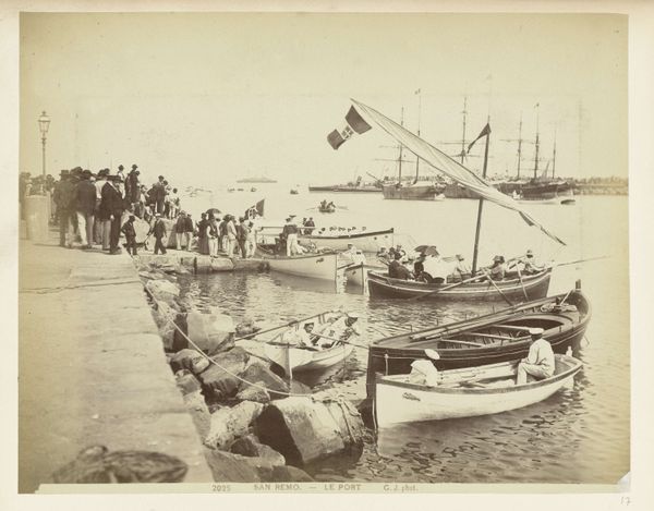 Curator: This gelatin silver print by F. von Pöppinghausen captures "The Sinking of a Tunnel Section in the Maas River, Rotterdam," sometime between 1892 and 1898. What is your first impression, Editor? Editor: The sheer density of bodies juxtaposed with those colossal iron pipes is what strikes me. The stark tones highlight the immense labor involved. Curator: Indeed. Von Pöppinghausen uses a high vantage point, compressing the space to emphasize the sheer scale of the project and the unified action of the workers. The dark accents of the figures' attire contrast sharply against the neutral background, almost mirroring the dark steel sections they're manoeuvring. Semiotically, the presence of the flags indicates themes of progress and national pride. Editor: Yes, and if you consider what "progress" means in concrete terms, it meant jobs – often dangerous ones. Looking at this photograph through a material lens, the actual act of "sinking" those tubes, considering the dangers involved, speaks of immense human effort and technological reach. It highlights a pivotal moment in industrial production that deeply impacts everyday cityscapes. Curator: True, the repetition of shapes – the cylindrical pipes, the round buoys – lends a structured rhythm, but the subtle gradations in the monochromatic palette ensure the photograph avoids monotony. This is balanced with almost mathematical precision; it’s a carefully composed study in form and perspective. Editor: Yet there is a beautiful tension as we study how these workers grappled with these large materials. We often distance ourselves from that effort, and this picture shows how deeply entangled lives are in this industrial effort. It emphasizes human struggle at the confluence of industry, ingenuity, and community. Curator: It’s compelling how von Pöppinghausen brings all those elements together. A visual document of industrial endeavor that still offers a masterclass in photographic composition. Editor: Agreed. The print pulls together so many different strands of materiality, and offers a nuanced vision into the era's relationship with work, progress, and transformation of urban environments.