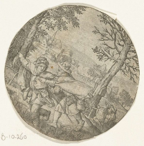 Editor: Here we have Hendrick Goltzius's 1586 etching, "The Blind Leading the Blind," currently held at the Rijksmuseum. I’m struck by how chaotic yet contained the composition feels within the circular frame. What do you see in this piece, beyond just the obvious interpretation of the proverb? Curator: Well, immediately, I see a pointed critique of social structures and leadership during a turbulent period. Goltzius created this print during the early years of the Eighty Years’ War. This was a period when many felt their leaders were making one mistake after another, leading them down a dangerous path. Editor: So the blind men represent, perhaps, misguided authority figures? Curator: Precisely. The proverb itself predates this etching by centuries, finding its roots in the Bible. Its constant re-emergence across time shows us its enduring relevance as a powerful social commentary during times of crises. What are your thoughts on how the landscape plays a role in conveying Goltzius's meaning? Editor: It does feel almost allegorical – the figures are trapped within the landscape as the cycle of failed leadership will continue to have severe impact on all levels of society. Also, the physical comedy seems almost… cruel? Curator: Perhaps, but isn’t it in line with a long history of visual satire that often used caricature and dark humor to highlight social failings? Goltzius, through this seemingly simple etching, invites us to critically examine the foundations upon which societies place their faith. It also raises some concerns in today's world. The main concerns being power and responsability within diverse contemporary social systems and political agendas. Editor: I didn’t initially consider the socio-political implications. This makes me think differently about the artist’s intentions! Curator: Exactly, seeing art as part of a broader social dialogue enables us to gain much better awareness of past and present injustices.