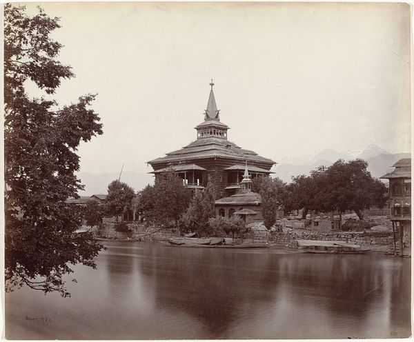 Editor: Here we have Samuel Bourne's "Gezicht op Srinagar in Jammu en Kashmir in India," taken in 1864. It’s a gelatin-silver print depicting a cityscape with a river running through it. I find the overall tonality quite calming; it’s almost monochromatic. What catches your eye? Curator: Primarily, the composition intrigues me. Observe how Bourne uses the river Jhelum as a dominant horizontal element, effectively bisecting the image. The architectural structures on the banks, culminating in the Shah Hamdan Mosque, offer a compelling vertical counterpoint. The buildings punctuate the scene. What semiotic relationships do you see emerging from the placement of the mosque, versus the humbler dwellings that frame the picture? Editor: I guess the mosque is emphasized, suggesting cultural and perhaps political importance through visual prominence? How much does the photographic medium influence this perception? Curator: Precisely. Consider Bourne's masterful manipulation of light and shadow, characteristic of the gelatin-silver process. Note the textures rendered, from the placid river to the intricate wood-worked architecture, how does this inform our understanding of materiality within the colonial gaze of landscape photography? Editor: The textures do add depth! The attention to detail in the mosque and the buildings lining the water's edge gives it a kind of tactile quality despite being a two-dimensional image. Curator: Indeed, a visual echo. The interplay invites the eye to wander, prompting considerations about civilization and environment. The way this oriental landscape, its structure and light contrasts the typical landscapes back home. It invites an almost alien interpretation, even by modern eyes. Editor: I see now. So the formal elements really dictate how we perceive the subject and the themes it conveys. Curator: Exactly. Analyzing solely the visual structure offers considerable insight, even detached from precise historical narratives. The artwork holds value in composition itself. Editor: Thank you for pointing out those crucial aspects, seeing beyond the subject matter to appreciate the image's internal relationships has been helpful.