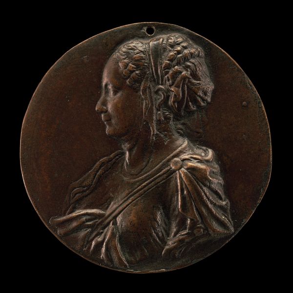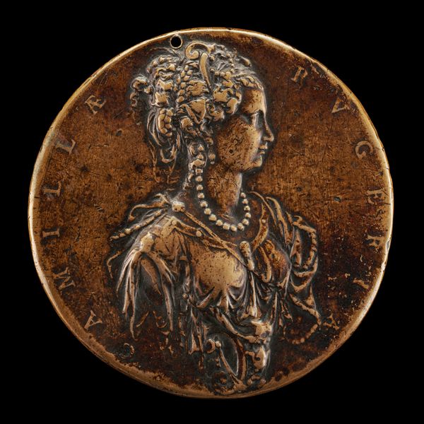 Curator: Looking at this bronze medal of Cassandra Marinoni, Marchioness of Soragna— likely crafted sometime after 1552 by Pier Paolo Galeotti—I am immediately struck by its exquisite detail, like a whispered secret from the Renaissance. What do you make of it? Editor: It's remarkable, the detail Galeotti achieved in this small space. But my immediate thought goes to power and representation. Cassandra Marinoni isn’t just being portrayed; she's being memorialized, legitimized through this bronze casting. What does it mean for a woman to be preserved in this way during that period? Curator: Ah, but bronze itself has that almost magical quality, doesn’t it? I imagine Galeotti holding this disc, imbuing it with… something beyond likeness. It feels alchemical. Each hammered detail on her dress looks as intricate as frost. Editor: It is alchemy of sorts, imbuing social meaning into art, isn't it? Bronze connected rulers with concepts of stability and permanence since antiquity. And now this medium depicts a woman of power. It really makes you consider her agency, how actively she participated in creating her own image. It wasn’t just about surface likeness, was it? Curator: Her face, the set of her jaw…it speaks of someone with agency, indeed. She clearly understood how to carry herself within a courtly sphere, even beyond, making a place for herself in society that maybe wasn’t traditionally ‘allowed’. Almost… audacious? Editor: Precisely. Think of the limited roles often assigned to women in art and life—muse, mother, object of beauty. Marinoni, here, defies those simplistic categories. She's making a claim. It's there in the inscription encircling her. It signifies far more than simply immortalizing her looks. Curator: The Renaissance liked to blur lines didn’t they? Perhaps Galeotti saw in her some echo of a Roman empress—or did she see it in herself, even project this power? A bit cheeky maybe? In any case it must have taken a good dose of imagination for a piece like this. Editor: Perhaps. But Galeotti, through bronze, creates a physical artifact, meant to circulate, to declare Marinoni's presence and stature to everyone who handled it, an idea materialized for generations. Curator: A reminder—set in bronze. A small moment, eternally cast. Editor: Exactly. It urges us to consider who holds power in representation.