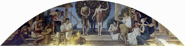 Editor: Here we have "Sculpture," a painting, perhaps a mural, by Walter Crane. It feels classically allegorical, but there's a mournful air about it, particularly with the central figure in grief. What do you see in this piece? Curator: This mural encapsulates a moment of crisis in artistic identity. We see the artist grappling with the power structures that dictate what is considered ‘high’ art versus craft. The kneeling figure draped in sorrow likely represents art itself, mourning the dominance of sculpture, the supposed ideal form. Crane, influenced by socialist ideals, might be critiquing the elitism embedded within academic art. Editor: So you're suggesting Crane is commenting on the hierarchy within the art world itself? I hadn't considered the sociopolitical undertones. Curator: Exactly! The triumphal figures looming above art reflect the rigid expectations and classical standards upheld by institutions, stifling other forms of creative expression, particularly those connected to working-class movements. How does the inclusion of historical figures influence your perception? Editor: It reinforces the connection to established authority and the weight of tradition bearing down on artistic innovation. I see how it’s not just a beautiful image but a potent statement on the politics of art. Curator: Indeed, Crane compels us to question how artistic value is constructed, promoted and ultimately, who benefits from it. Hopefully you will think of these questions when you approach artworks in the future. Editor: That is a brilliant insight, thank you so much for opening my eyes to the underlying discourse and power dynamics in visual arts.