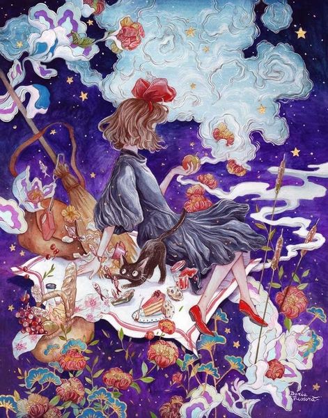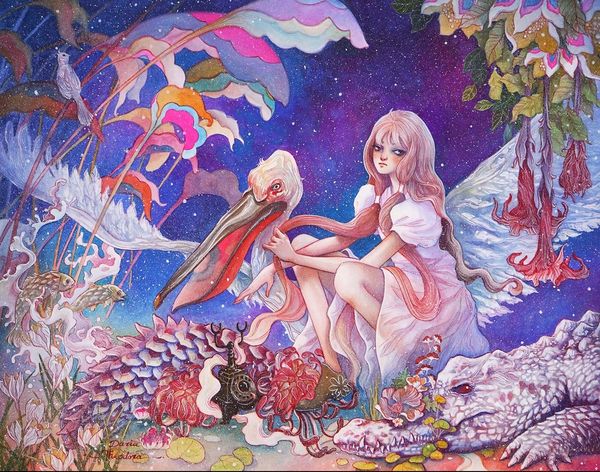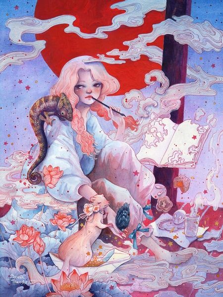 Daria Theodora imagined “The World As The Lord Offers” in paint, and probably a sprinkle of fairy dust. The colors feel so dreamy, almost like the world is breathing cotton candy. It’s clear that each choice, each mark, is a part of the journey of the painting. Look how the goat, with its fancy monocle, is built up with layers of purples and blues, tiny flecks of white like distant stars. This gives the piece a feeling of depth, making you feel like you could almost reach out and touch its silky fur. Then there’s the toad with the crown, his long tongue reaching for a pearl. He is such a bizarre and wonderful addition to this dreamscape. He is like something out of a fever dream! The whole thing reminds me of Paula Rego’s work, with its off-kilter storytelling. There’s no one way to read it, which is part of the fun, right?