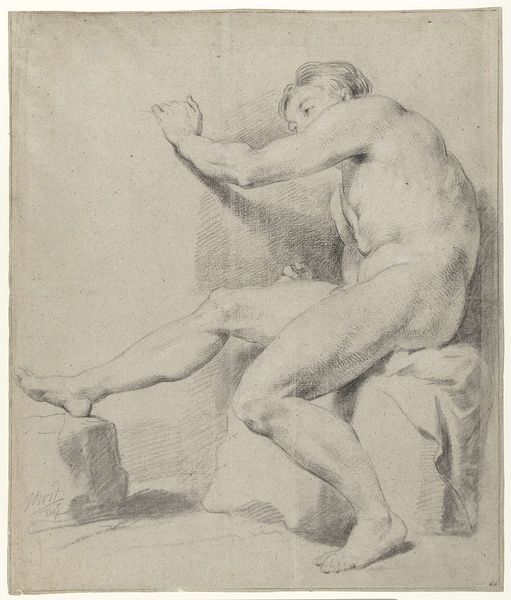 Here is the audio guide script: Jan Hoogsaat rendered this drawing of a seated male nude with graphite. The figure is arranged diagonally, creating a dynamic composition. Hoogsaat's handling of light and shadow models the figure and emphasizes its musculature. We can analyze this through the lens of semiotics, the study of signs and symbols. The male nude, particularly in a classical pose, functioned as a signifier of ideal beauty and strength, echoing the values of classical antiquity. However, the anatomical imprecision and the mundane setting—suggested by the plain background—might destabilize these established meanings. The lines of the graphite, with their varying thickness and direction, create texture and depth. Hoogsaat seems less concerned with an exact representation of the human form and more interested in exploring the expressive potential of the medium. The way the figure is posed, with a raised leg, creates a sense of imbalance, further challenging traditional norms of representation. This drawing functions not just as a study of form but also as a subtle commentary on the evolving artistic and cultural values of its time.