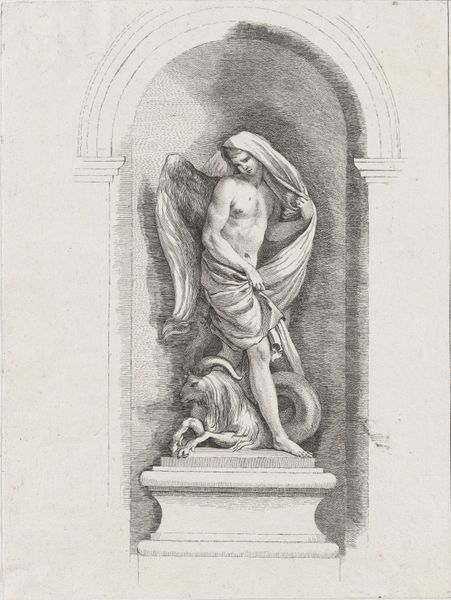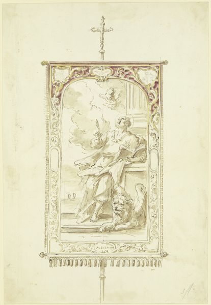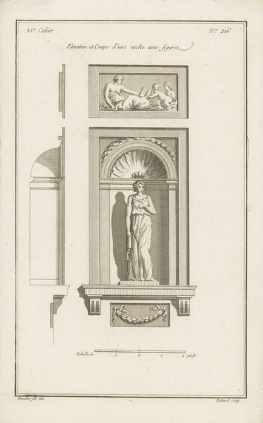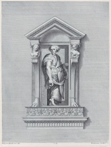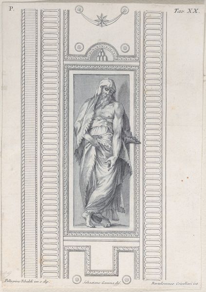 Editor: Here we have "Plate 19: figure seen from behind with left hand raised," an engraving from 1756 by Bartolomeo Crivellari. The figure, positioned within this elaborate, almost architectural frame, appears quite theatrical, perhaps caught mid-speech or gesture. The detailing in the robe is remarkable, as is the positioning of the subject inside the decorative frame. What draws your attention when you view this piece? Curator: Immediately, the composition strikes me. The figure, while central, is almost overpowered by the surrounding framework. Observe the linear precision of the engraving, the carefully constructed layers of detail within the borders versus the relative simplicity of the figure itself. Note, as well, the deliberate contrast in texture; the smooth planes of the frame against the textured fabric of the figure's garments. Is the artist commenting on the dominance of structure over substance, or perhaps on the constraints imposed upon the human form? Editor: That's an interesting point about structure versus substance. The frame really does command a lot of visual weight. I was focused on the dynamism of the figure, but you've re-centered my attention. Is the flatness of the figure significant here, too? Curator: Precisely! The shallow depth of field contributes to this sense of the figure being contained, flattened against the picture plane. Consider, also, the restricted palette. The absence of color forces us to concentrate on the tonal variations achieved through line and hatching alone. Does this limitation enhance or detract from the work's overall impact? Editor: I think it enhances it, in a way. It brings a certain formality and intensity to the composition. Thanks for pointing out the interplay between figure and frame; it really shifted how I see the piece. Curator: Indeed. Through the careful study of these visual elements, we arrive at a richer understanding of the artist's intent and the work's inherent qualities.
