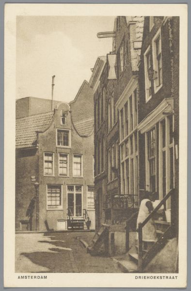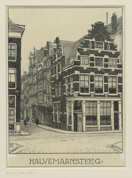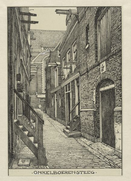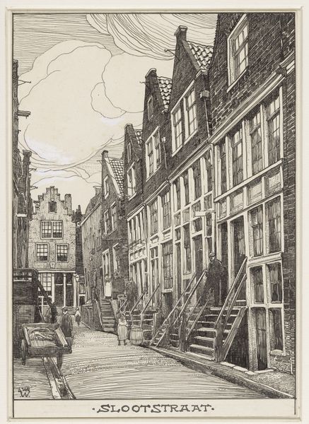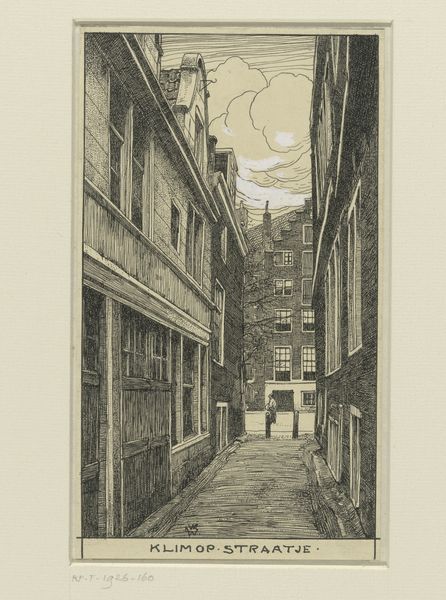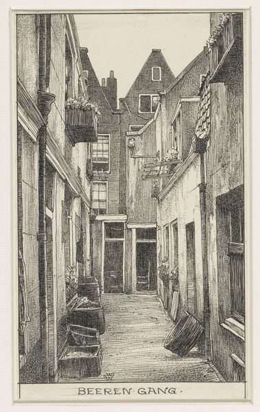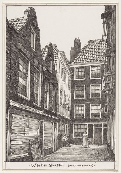 Editor: This is Willem Wenckebach's "Schoone Weespad te Amsterdam," a drawing in ink from somewhere between 1870 and 1926. It's a cityscape, and the sharp lines give it a very formal, almost clinical feel. What strikes you most about it? Curator: The architectural precision is indeed striking. It’s less a picturesque view and more of a documented reality. Considering the time frame, what do you think this meticulous representation tells us about the artist's intention or the social context? Was this documentation for historical preservation or some other purpose? Editor: That's a really good point. Maybe it was intended to record a street that was changing quickly during that time period? Or was maybe threatened with demolition? Curator: Precisely! The late 19th and early 20th centuries saw significant urban transformations. This level of detail could be a conscious effort to preserve a visual record of a specific moment in Amsterdam’s history, capturing not only the physical structures but also, implicitly, the social life embedded within those spaces. Have you noticed the scale of the figure within the drawing? Editor: I see him, yes! He almost disappears; it is difficult to gauge scale using his size! The architecture is the key component in the piece. Curator: The small figure reinforces the dominance of the built environment and suggests how the individual is situated within the urban fabric. Now that we consider this, what effect might the dominance of buildings have on the viewer? Editor: I hadn't considered that before, the figure as social context! So this piece isn't *just* about a street, it’s about a time and place, a commentary on how urban environments shape people's lives. Thanks! Curator: Exactly. It's a reminder that art can function as a social record, shaped by the artist's intention and the societal forces at play.