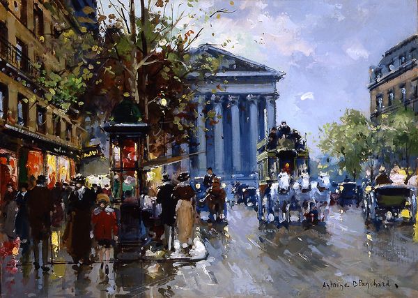 Curator: Oh, the bustle and gentle light! Looking at Edouard Cortes's oil on canvas, "St. Martin, Spring," it just breathes Parisian air. There's a vibrancy even without a specific date pinned to it, capturing a timeless slice of city life. What catches your eye first? Editor: Immediately, it's the way Cortes positions us, just off the main thoroughfare. The flowering cart—almost blocking our view. Whose perspective are we occupying, and why? It isn’t the bourgeois strolling on a sunny day, or is it? The image plays with ideas of spectacle and spectatorship—who gets to be seen? Curator: It’s true, we’re kind of tucked away on the side. But still bathed in that spring light—aren't we all, one way or another? To me, it feels less deliberate exclusion and more…well, finding the romance in the margins, where the light still dances on cobblestones and the city murmurs its secrets. It reminds me, isn't "flânerie" originally about finding liberation in observation? Editor: Precisely. The figure to our left appears confined and stiff in dark and constricting clothes that visually block us. Meanwhile, the flowers seem intentionally arranged to tempt the other observers and viewers with their vividness. If this is about "liberation in observation," what about all the ones left out? This image seems deeply preoccupied with class, though spring and fresh flowers act as a kind of palliative, no? Curator: Perhaps! Though the broad, open boulevard also lets light to reach unexpected corners. I mean, even in his choice of fleeting, almost hazy brushstrokes, Cortes shows us a moment not perfectly composed, but lived. The whole "impressionist landscape" allows us to capture the whole fleeting picture, spring after spring. What would you change about this image if you could? Editor: I'd love to push Cortes further. Whose liberation, exactly, does this 'fleeting picture' prioritize? And who pays for the privilege? I am especially intrigued by the flower cart. Flower selling was a major entry point for rural women coming into Paris, creating opportunities to have their bodies on full display, a precarious situation to occupy. Let's bring some of that complicated nuance into how we discuss his spring. Curator: Absolutely! Considering the lives intertwined within these grand boulevards allows us to fully witness its splendor, as well as question who's building it. Perhaps it reminds us that we never see a city in full without understanding those shadowy sides, either. Editor: Exactly. Cortes urges us to do so. Every springtime in every city asks for an ever vigilant eye for justice, fairness, equality and peace!