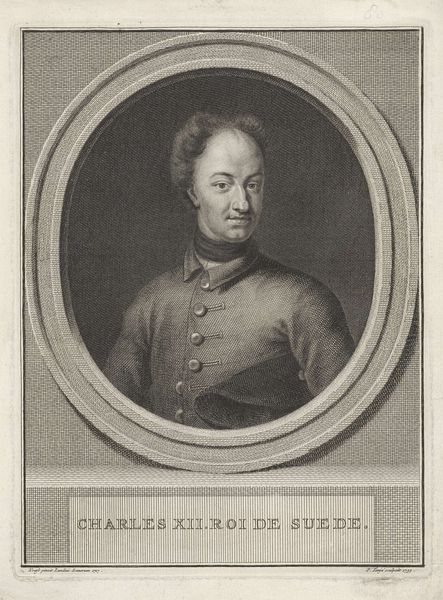 Editor: This is Pieter Tanjé's portrait of "Charles XII, King of Sweden." It's a print, and the detail is incredible. The king seems rather contemplative. What do you see in how this image was presented to the public? Curator: Consider the context: printed portraits like these circulated widely, shaping public perception. Tanjé's Charles isn't presented as a powerful conqueror, but as a more approachable, even vulnerable figure. This challenges the traditional image of monarchy. What effect might this have on viewers? Editor: It makes him seem more human, less like an untouchable ruler. Almost like propaganda of approachability. Curator: Precisely! It is a calculated effort to connect with the populace. The portrait flattens social distance, making power appear less absolute. Editor: That reframing is fascinating. I hadn't considered the political implications of portraiture in that way before. Curator: These images are not just records, but active participants in shaping political and social realities. Something to keep in mind.