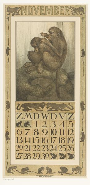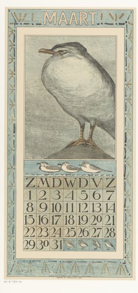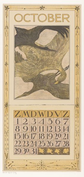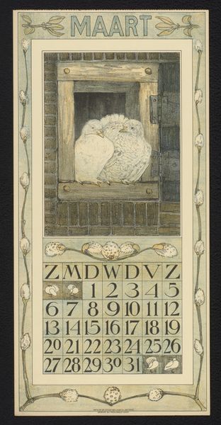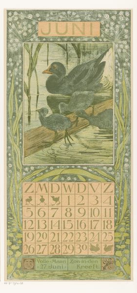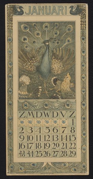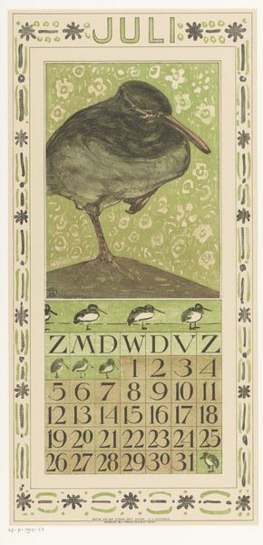 Editor: This is Theo van Hoytema’s "Kalenderblad juli met drie kuifkippen" – July Calendar Sheet with three crested chickens – from 1909. It seems to be a woodcut print. The chickens have such a unique look, so stately and self-possessed. What do you see in this piece beyond just a calendar page? Curator: I see a fascinating commentary on the burgeoning industrial era and its impact on traditional agrarian life. Hoytema, deeply involved in the Arts and Crafts movement, often depicted animals with a certain dignity, almost a subtle protest against mass production and the commodification of nature. Editor: So the chickens aren’t just chickens? Curator: Not at all! Consider the Art Nouveau style – that decorative framing, the stylized flowers, the almost obsessive detail in the chickens’ plumage. This style embraced craftsmanship and organic forms as a direct challenge to industrial uniformity. Hoytema’s choice of subject, rendered with such care, elevates these creatures. Are they a reminder of a simpler time? Are they a symbol of resilience and authenticity in a world increasingly dominated by machines? And why July? Think about what the animals could symbolize in terms of abundance, as the seventh month is often the apex of growth season. Editor: That's a really interesting way to look at it, framing the chickens as a resistance symbol! It never would have occurred to me that a calendar page could carry so much weight. Curator: Art has layers. By looking through social and historical contexts, the meanings multiply, revealing more than meets the eye.