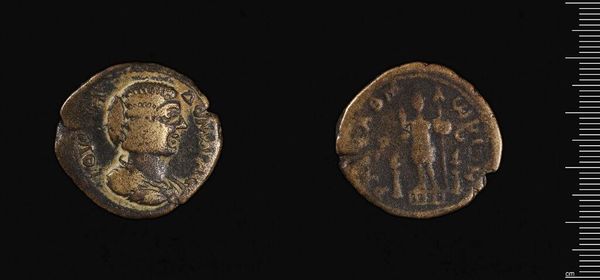 Editor: This is a coin of Demetrios II, from his second reign. It's so small, yet it depicts a portrait and another figure. How do you interpret the composition within such limited space? Curator: Notice how the artist utilizes the circular format to frame the bust of Demetrios, and subsequently, the figure on the reverse. The careful arrangement of these elements creates a balanced composition. Consider the textures achieved on such a small scale. Editor: What do you mean by textures? Curator: Observe the varying depths and patterns used to differentiate the figure from the background. The artist employs techniques to provide a sense of depth and dimensionality within a two-dimensional space, thus demonstrating skillful craftsmanship. Editor: So, by analyzing the internal structure, we can decode the artist's intention. Thanks for pointing out those technical elements! Curator: Precisely. Close observation allows us to appreciate the artist’s skill and intellectual engagement with the material.