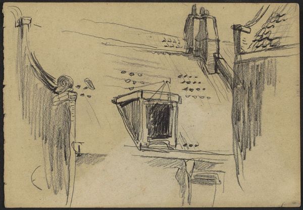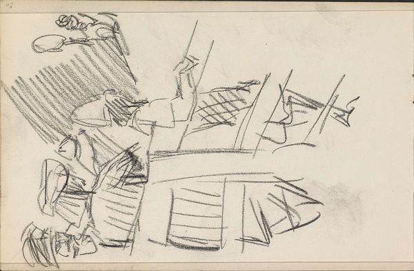 Curator: Look at this startling image by Karl Wiener, titled *Deutscher Soldat im Trommelfeuer*, or “German Soldier in a Drumfire”, created in 1942. Editor: My first impression is just pure, raw fear. The composition, with its fractured planes and claustrophobic geometry, immediately traps the viewer in that same moment of terror with the soldier. Curator: Yes, the fragmented, almost cubistic, style reflects the Expressionist movement and embodies the psychological trauma of warfare. You see how Wiener uses stark realism to depict a soldier overwhelmed by the horrors of what appears to be relentless shelling? Editor: Exactly, it's a masterclass in using formal elements to convey psychological experience. The lines are frantic, the shading harsh. This isn’t just a literal depiction of war; it’s an evocation of existential dread. The dark gray color represents bleak and desolate times. Curator: The soldier's wide-eyed gaze, his mouth agape, these are universal symbols of shock and horror. Even more haunting when you recognize the symbolism of the steel helmet as futile protection against the all-consuming destruction. It evokes countless generations confronting chaos. Editor: And it's all done with such a limited palette – almost monochromatic. Wiener brilliantly contrasts the solidity of the geometric forms with the ephemeral nature of the exploding shells, visualized as these ascending strokes of charcoal or graphite. Curator: It serves as a stark reminder of the human cost of conflict and how that experience is embedded in our collective consciousness. The cultural weight of these symbols — the soldier, the explosions — remains relevant even today. Editor: For me, analyzing the composition itself is powerful enough. This drawing stands as an effective representation of how human beings respond to chaotic stimuli by highlighting the fractured, anxious nature of existence. The image lingers in the mind. Curator: It certainly does. Wiener gives visual form to a feeling that, unfortunately, resonates across history. Editor: An example of pure expression and a poignant case of design following feeling.
