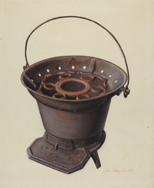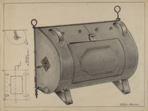 Samuel Fineman made this drawing of a roasting oven, but exactly when, I'm not sure. What strikes me is his approach, so deliberate, almost scientific, yet rendered with such delicate precision. You can see the gentle gradation of tone, moving from light to shadow, describing form in a way that feels both mechanical and deeply human. The drawing’s surface has a subtle texture to it, but overall it is a cool, industrial object depicted with a sense of care. Look at the way Fineman uses the white of the paper to suggest the inside of the oven; it's a pure, untouched space, a blank canvas awaiting transformation. The metal of the oven, rendered in shades of gray, feels smooth and cool to the touch. You can almost feel the weight and solidity of the object. Fineman’s drawing reminds me a bit of the meticulous work of Agnes Martin, though Martin was more interested in abstract forms. Both show a similar dedication to their craft and a willingness to embrace ambiguity.