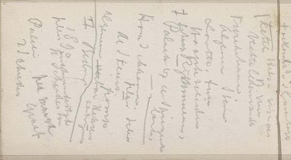 Editor: Here we have "Notities," a 1905 ink drawing on paper by Willem Cornelis Rip. At first glance, it looks almost like a page ripped from a notebook, filled with handwriting and measurements. How do you interpret this work? Curator: This image, like the fragments of memory, connects to a rich network of cultural symbols and traditions, doesn't it? The handwriting itself becomes a kind of landscape, evoking personal memory and lived experience. We must remember the power of handwriting as a uniquely personal expression during that time. Editor: It feels very intimate, like we are intruding on a private thought process. What’s the significance of recording what seem to be measurements and notes? Curator: It is reminiscent of older cultural beliefs about observation. Early psychological studies suggest such records are mnemonic aids, a visual language constructed to hold complex meaning. Rip might have sought to understand how we assign value to places and objects, and what significance they hold in our psychological landscape. Notice the looping script that evokes spatial dimensions! Editor: That makes sense. So, he is using these words and numbers to capture a feeling, or a memory of a place. I initially saw this work as quite plain. But the layers of meaning makes it richer than I thought. Curator: Exactly! And think about the artistic shift happening around that time, moving from representational accuracy to the symbolic and emotional potential within the seemingly mundane. A fragment can often evoke much more than a complete image, can't it?
