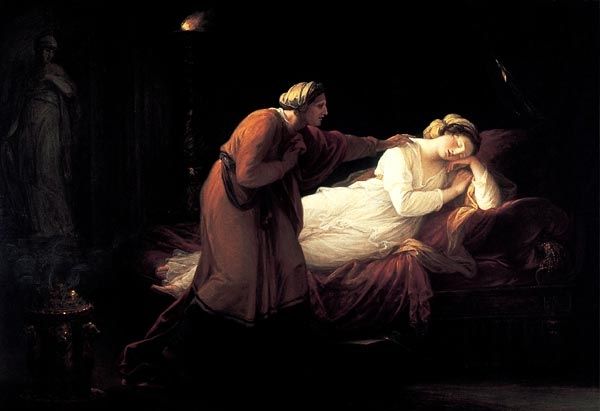 Millais viewed "Speak! Speak!" as one of his most serious and profound works. His son, J.G.Millais, explained it as follows: ''A young Roman has been reading through the night the letters of his lost love; ... at dawn, behold, the curtains of his bed are parted, and there before him stands, in spirit or in truth, the lady herself, decked as on her bridal night... An open door displays the winding stair down which she has come''. It was bought for the nation for £2,000, an enormous sum in 1895 which marked the extent of Millais''s professional reputation at this date. Gallery label, September 2001