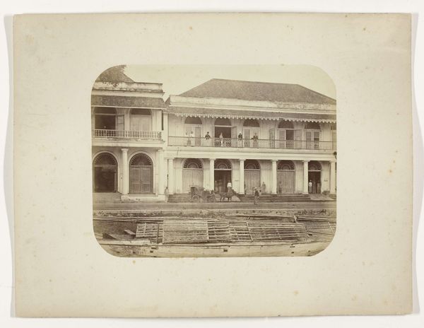 Curator: What a fascinating image we have here from before 1905. This albumen print, taken by G.R. Lambert & Co., showcases the “Woonhuis van de directeur van de Tanjong Pagar Dock Co. Ltd. in Singapore”—that is, the residence of the director of the Tanjong Pagar Dock Company in Singapore. It now resides in the Rijksmuseum. Editor: The composition initially feels very staged. A bit too pristine. The building itself is beautiful, stately even, but there is something sterile in the photograph’s precise angles and almost complete lack of people. Curator: It is incredibly important to remember that photography in this period often carried a specific ideological weight. Images like these, particularly when commissioned, served to project a certain image of colonial power and order. The house is undoubtedly grand, but think about what it represents: the infrastructure that facilitated resource extraction and trade at the expense of local communities. The very cleanliness you noticed served to visually legitimize colonial endeavors. Editor: The house as a symbol is quite interesting when seen from that viewpoint. There is this clear attempt to project authority but look at the architecture! It mixes classical European motifs with, perhaps, adaptations suited to a tropical climate. Does this blend inadvertently point towards the constructed nature of colonial power— a pastiche meant to impress? Curator: Precisely! And notice how the local landscape, while present, seems secondary. The focus remains steadfastly on the building, and what the building, in its turn, signifies in terms of societal stratification. Who could access it? Whose labor built it? Whose wealth sustained it? These are all important entry points into its history. Editor: The flag atop the building then, takes on an extra layer of meaning. Flags are always signifiers, naturally, but here, in conjunction with the architecture, the manicured lawn, and even the stark photographic style, we see a convergence of symbolic power meant to solidify control and create specific impression of superiority. I wonder about the absence of shadow and what that evokes in relation to my perception. Curator: It definitely demands we confront some complex historical realities when looking at what appears to be simply a "house" on the surface. It reveals just how deeply implicated aesthetic representation can be in complex systems of power. Editor: Looking at this photograph through both the lens of colonial ambition and symbol analysis enriches my appreciation. It reminds us that these seemingly simple images encode layered cultural, economic, and historical narratives waiting to be unpacked.