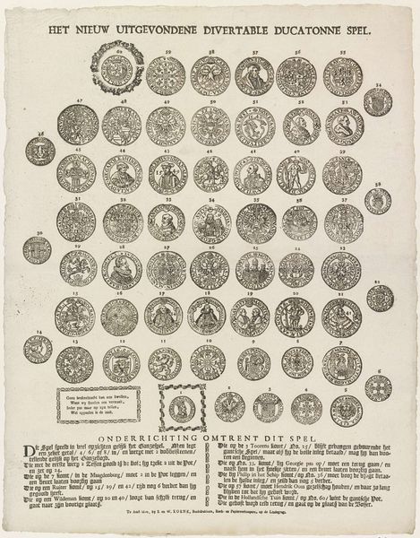 Editor: Here we have “Bordspel Doggersbank, 1781,” a game board created by A. Bouwens and held at the Rijksmuseum. It’s an etching and engraving on paper depicting ships circling what I presume is Dogger's Bank. The image is dominated by this circular board, divided into sections like a twisted, nautical roulette wheel. How should we interpret this work purely through its visual and structural elements? Curator: We should start with its arrangement. Observe how the design insists on circularity, a closed system of signs. Ships, repeated and labelled, orbit a central void marked as Dogger's Bank. Consider the binary logic at play. Dutch ships confront their English counterparts in a balanced, almost symmetrical layout. What purpose does this tension create for you? Editor: The circular form gives it an overall balanced tension, with both the ships and language working as elements of opposition that are also complementary to the wheel. Curator: Precisely. Note, however, that within the apparent balance, there's asymmetry. The graphic qualities differ among sections; text density varies, as do the illustrative details of each ship. Such discrepancies create focal points, disrupting total visual harmony. How might the lines and textures influence the movement of your eye across the print? Editor: The varying line weights, like the heavier ropes between sections, do add dynamism, pushing you to focus on the individual vignettes even while taking in the whole. It’s as if the details are pulling you away from the overall structure, which then pushes you to refocus on the overall design of the piece. Curator: Well articulated. Ultimately, it is not only the subject represented, but also its construction that evokes meaning and generates a visual experience within a defined structure. Editor: This approach helps me appreciate how the artist manipulated visual form to create something beyond just the representation of ships.