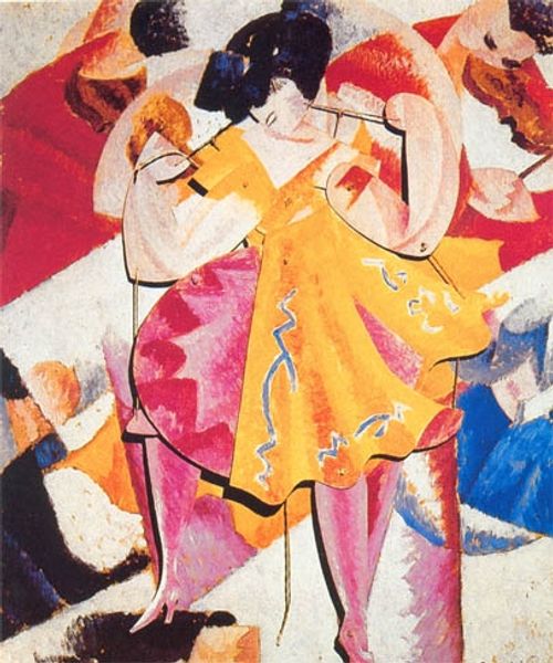 Curator: Welcome. We're looking at August Macke's "In Front of the Hat Shop (woman with red jacket and child)," created in 1913. It resides in a private collection, and its rendering suggests gouache and perhaps oil pastel, given the richness of color. What strikes you most? Editor: Oh, immediately? It feels like a whispered secret of a memory. The colors are vibrant, but softened. It's dreamlike. I imagine a stolen moment from childhood. Curator: Yes, the application of pigment contributes to that sense of fleeting impression. The almost casual depiction of the modes creates a discourse around access and the construction of identity in early 20th century urban life. How would that chime in with your feelings? Editor: That’s interesting… I am struck by how solid yet stylized those shapes and forms of the Modes are, giving it this sort of sturdy almost playful essence. It's not slavishly devoted to representing reality, that's for sure. I'm not immediately worrying about identities in a modern urban setting, but maybe feeling this inner world, which then intersects with consumerism represented by the shop? Curator: Precisely. Macke deliberately abstracts the figures, almost as vessels interacting with a space of commercial display. Consider the red jacket; a strong color set against more muted tones, symbolic of burgeoning consumer culture and material desire of the period? Or is this, too, too pragmatic a way to put the art into discourse of consumerism? Editor: Okay, I see your point. But let me float an idea. What if the red is not desire, but… urgency? That splash against this otherwise calming scene is to me more exciting than anything else. I feel invited. There’s movement. There’s… somewhere to go! It has a theatrical nature, like walking onto a stage. But both are true maybe? Consumerism is both those urges, of course. Curator: The artist employs what seems to be almost a pastiche of mark-making that reinforces the complex dynamics of the era. His decision of colors and composition contributes to its visual encoding. Editor: Right, well, my materialist friend, as always, your insights are helpful at teasing out those hidden nuances embedded within. But for me, I still think it's lovely. Simple as. It hits the heart first and, yes, maybe nudges the brain afterward. Curator: I think that's a perfectly valid and fitting emotional point to conclude upon. Thank you for your perspectives, too!