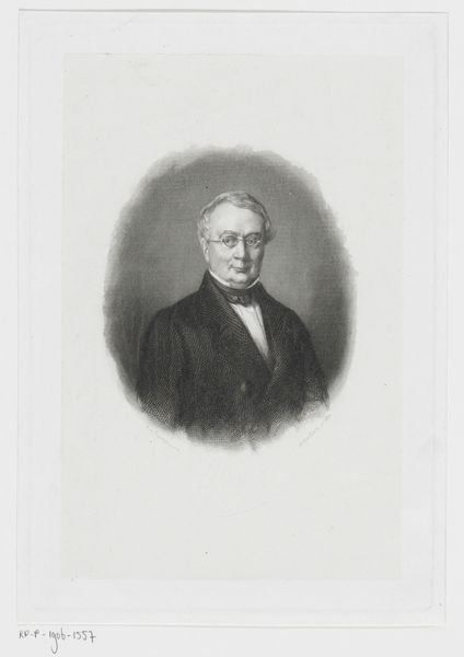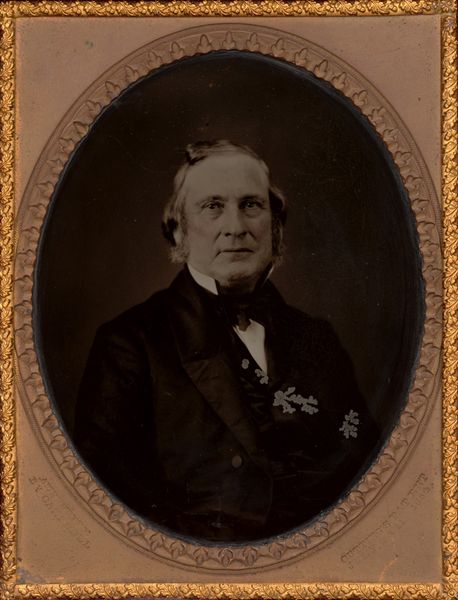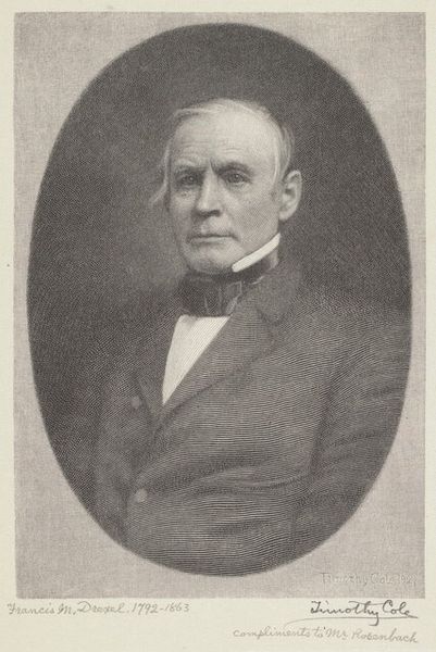 Editor: This is Frederic Porter Vinton's portrait of George Frisbie Hoar. It's quite imposing in its scale and monochromatic palette. The composition seems rather formal. What do you see in this piece? Curator: Note how Vinton meticulously models the light across Hoar's face, creating a focal point. Observe the geometric arrangement; the stern verticality of Hoar against the horizontal lines of the table and books. Consider the subdued tonality, devoid of vibrant color. Editor: So the power lies in the contrasts of light and shadow and the geometric forms within the subdued palette? I see it now. Curator: Precisely. The composition, though seemingly traditional, reveals a sophisticated understanding of form and visual weight. These elements, when considered together, construct a portrait of considered authority. Editor: Thanks, I'll definitely look closer at the use of form in similar portraits moving forward.