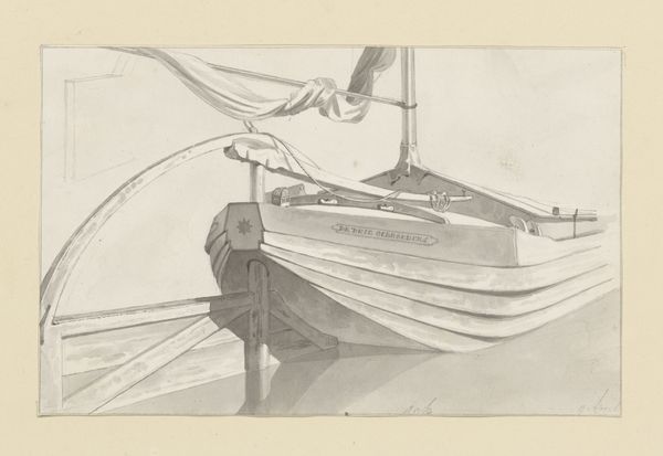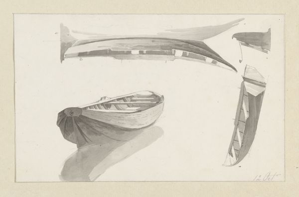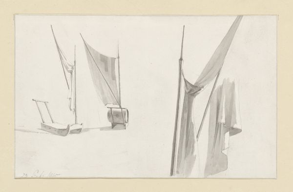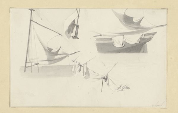Editor: So, here we have Hendrik Abraham Klinkhamer's "Studieblad met masten en zeilen," or "Sheet of Studies with Masts and Sails," made sometime between 1820 and 1872. It's a pencil drawing on paper and its softness and multiple viewpoints almost makes it feel like a memory. What catches your eye about this piece? Curator: Immediately, I think about the tradition of maritime painting and the relationship between the Netherlands and the sea. During Klinkhamer's time, seascapes often served a very specific purpose: they weren't just pretty pictures; they depicted Dutch power, trade, and exploration. Do you think this study plays into that at all? Or is it something else? Editor: Hmm, I'm not so sure. Because it is clearly just a sketch it does not come across to me as that. To me it feels like the artist may be just practising painting sails and not so much trying to present Dutch Power. Curator: Good point! It is less about a formal declaration and more about the nuts and bolts, like how an engineer might sketch bridge supports. But that begs the question, what place did such seemingly apolitical studies occupy in the broader visual culture? Artists often sketched these technical aspects in preparation for larger commissions, so they are also indirectly a reflection of Dutch economic and cultural influence during that period. What do you make of its seeming simplicity, its refusal to engage in the grand narrative? Editor: That makes a lot of sense. So even a simple sketch can still reveal something about a country's history and even politics! I would have missed all this looking at this artwork in isolation. Curator: Exactly. That's the exciting part about viewing art through a historical lens. We dig a little deeper and ask what appears to be 'simple' a little more scrutiny.
