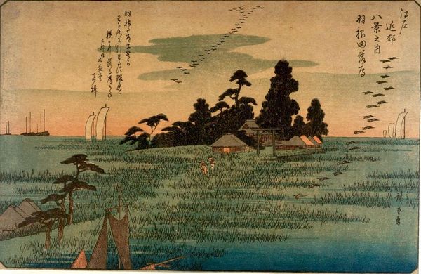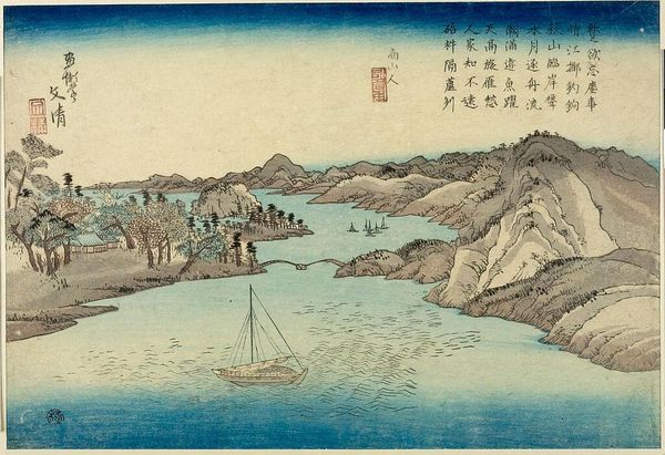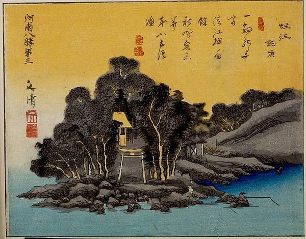 Editor: This is "No. 32, Shirasuka: Shiomizaka" by Utagawa Hiroshige, from the Tōkaidō Road series. I’m struck by how the steep path dominates the composition. What does this piece say to you? Curator: Notice how the woodblock printing process allows for mass production. These prints weren't precious objects but commodities, reflecting a growing merchant class consuming travel and leisure imagery. How does that change your perception? Editor: It makes me consider who these images were made *for*, not just what they depict. Thanks! Curator: Precisely. The materials and their distribution reveal much about the society that produced and consumed them.