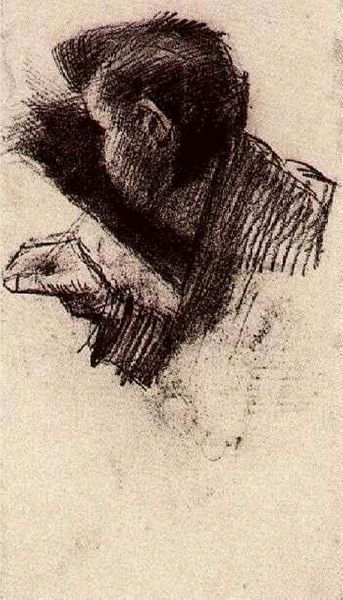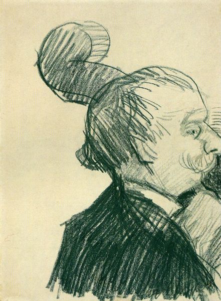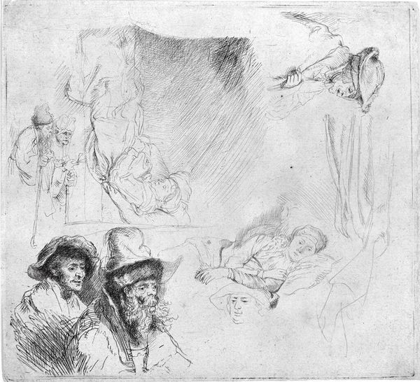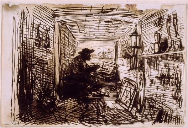 Editor: Here we have Whistler's pencil drawing of Fantin-Latour in bed, titled "Fantin Latour drawing Sun". The monochromatic quality gives it an intimate, almost vulnerable feel. What strikes you about its visual structure? Curator: Indeed. Immediately, the focus is on the interplay of light and shadow created by Whistler’s expressive use of line. Notice how the density of the pencil strokes defines form, particularly around the subject’s face and hat, in contrast to the more sparsely rendered bedding and background. Do you observe how these variations in line weight suggest depth? Editor: Yes, the shading gives volume to Fantin Latour and to his working surface, yet other areas remain quite flat. What’s the effect of that contrast between depth and flatness? Curator: Precisely. This contrast maintains a tension between representation and abstraction. The subject is discernible, yet the work insists on its own materiality—on the fact that it is, after all, merely lines on paper. Whistler privileges formal concerns over mimetic accuracy, directing our gaze toward the drawing’s intrinsic qualities rather than its subject matter. Do you find this tension aesthetically pleasing? Editor: I see what you mean. I like the dynamism created by the different strokes in portraying depth, yet its "unfinished" quality opens the drawing up for different readings. Thank you! Curator: A rewarding analysis indeed. We began with the texture and came to the representation of form through the masterful manipulation of a humble material, graphite. A testament to the power of drawing.