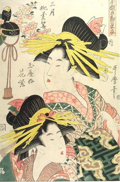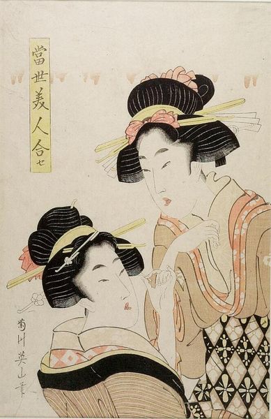 Editor: This is Kitagawa Utamaro II’s "First Dance Recital by Young Geisha." The muted tones and delicate lines give it a dreamlike quality. What can you tell me about the production of this print? Curator: The materiality speaks volumes. Ukiyo-e prints like this were a commercial product. The process involved collaboration: the artist, block carvers, and printers. How did the economics of art production shape its aesthetics, do you think? Editor: That's fascinating; I never considered it in terms of art's economics. Thank you! Curator: Precisely. The demand for these affordable prints dictated subject matter and style. Something to consider.