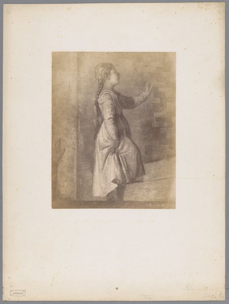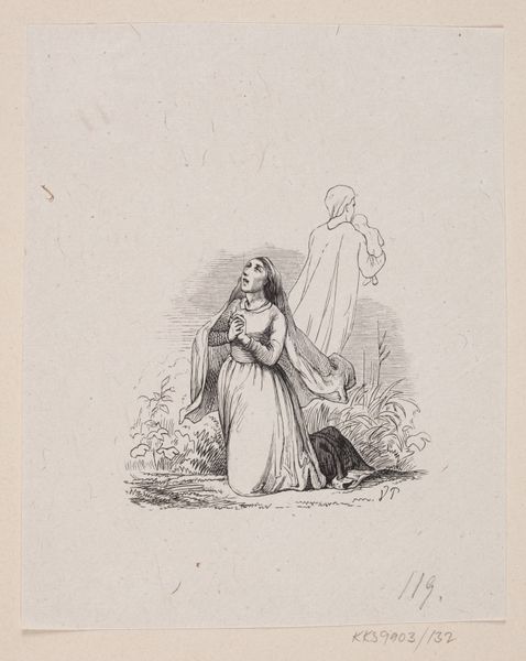 Curator: Immediately, what strikes me about this drawing is the almost stoic stillness, despite her hair flowing wildly as if caught in an invisible gale. Editor: That's perceptive. Let me introduce "Vrouw uit Zwitserland", or "Woman from Switzerland," a drawing rendered in ink on paper dating back to 1569. It resides here at the Rijksmuseum, and we attribute it to Fernando Bertelli. Curator: Switzerland! Ah, now that sign beside her makes sense! Did they pose her outdoors, do you think? The landscape feels quite symbolic and staged rather than taken from life. Editor: It's Northern Renaissance through and through; a dance between the real and the allegorical. The signboard does add an odd touch though. Typically, these small drawings of “landsknechts” or noblewomen would identify these regional “types”. She is standing upon the “confederation”. It seems, though, in this image, we can see it both literally and perhaps also in its burgeoning conceptual moment in this drawing! Curator: So she represents an entire territory... weighted with symbolism of nascent national identity. No wonder she appears so composed, even serene! Yet there is the contradiction in that wild hair--such a wonderful detail against that sense of containment from her headdress and severe gown. And the lines—crisp, elegant but somewhat cold as well? Editor: Cold is an interesting word for it... almost clinical, yes, in its detail and precision. I see a determined clarity instead. Bertelli's style embraces linearism that became prominent then, particularly evident in how he delineates the folds of her dress and the textures. Her gaze doesn't waver, doesn't invite intimacy; there is that stoicism again. I'd venture to suggest this "coldness" helps embody the idea of Helvetia as a region. Regions are always idealized constructs and projections. Curator: It does hint at her virtue… This is how nations were personified at this point! Though to modern eyes, those puffed sleeves appear ever so slightly absurd. The effect makes the woman, her character… abstract almost in their deliberate artificiality… But now I think, maybe they also underscore the inherent tension within the very idea of representing an entire people in a single image, don’t you think? Editor: Precisely. I’ve always loved images like these for freezing certain political moods and emotional economies for centuries afterward. They show us a collective idea taking shape… but with plenty of visual quirks in the process. Curator: Wonderful. Next artwork, please? I'm eager to uncover more buried stories.