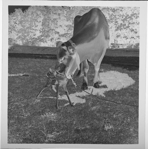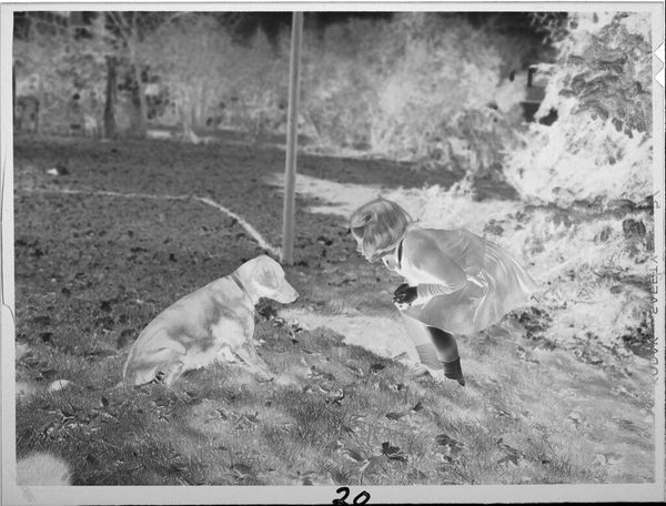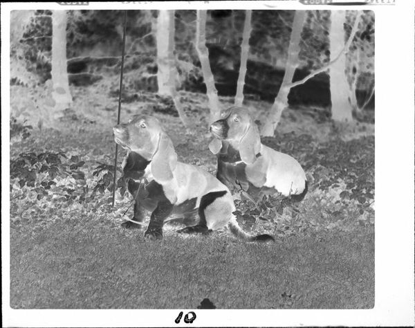 Curator: This is a photograph titled "Untitled (two basset hounds)" by Lucian and Mary Brown. Editor: The inverted tones give it a dreamlike, almost melancholic quality. There's a stillness about the dogs. Curator: Note how the formal elements, the contrast between light and dark, create a strong sense of depth despite the small scale. The texture is also noteworthy. Editor: Dogs, historically, are potent symbols of loyalty and companionship. These hounds, so docile, seem to embody domestic harmony. Curator: Indeed, and the composition, with the dogs slightly off-center, creates a dynamic tension. Editor: I'm left pondering the quiet stories these images hold, their connection to our shared cultural memory. Curator: A fascinating study of light, form and subject in a seemingly simple image. Editor: Yes, a poignant reflection on canine companionship and human connection.