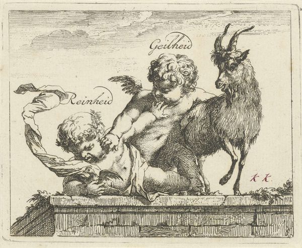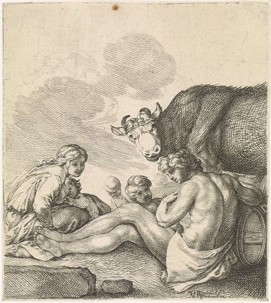 Curator: Here we have Willem Panneels’ “David killing a lion and a bear,” created between 1610 and 1634. This print, residing here at the Rijksmuseum, depicts David’s triumph. What’s your initial take? Editor: Well, first off, it's intense! The dynamism of the wrestling figures is remarkable, even in this small-scale print. The hatching and cross-hatching give it a raw energy. Curator: Agreed. Let’s delve into that 'raw energy'. Considering Panneels worked in Rubens's workshop, this engraving speaks volumes about the dissemination of artistic labor and influence in 17th-century printmaking. Think of the process involved, from the initial sketch, likely by Rubens himself, to Panneels’ execution and the multiple impressions made for circulation. Editor: Precisely. The formal qualities reflect that dynamic exchange. The composition—the interwoven figures, the contrast of light and shadow—directs the eye to the central struggle. Notice how the lines create a sense of depth despite the limited tonal range. It’s Baroque energy condensed. Curator: It makes you think about printmaking as early forms of mass production. Each impression carries the mark of that collaborative process and extends the reach of these iconic narratives to wider audiences. The social aspect, beyond the art object, is really at play. Editor: Indeed. And it's hard to ignore the symbolic weight of those conquered beasts, emblems of chaos and untamed nature subdued by divinely sanctioned strength. They represent more than mere animals; they're embodiments of threats to the social order. Curator: And what do you make of those sheep clustering to the side? Are they witnesses? Symbols of the flock under David’s protection? How does their representation play with your idea of “social order?" Editor: Perhaps. They provide a certain balance, visually anchoring the chaotic violence. Their placid presence enhances the drama, yes, underscoring what is at stake in this heroic confrontation. They provide a sense of perspective on a broader theme: divine providence shielding the innocent. Curator: I hadn't considered that—brilliant! Editor: Well, on that note...it's quite interesting to unpack a work like this—so economical in means, yet rich in both drama and meaning. Curator: Exactly. I see this not just as an object of aesthetic value, but also as a document that exposes networks of labor, religious zeal, and popular demand.