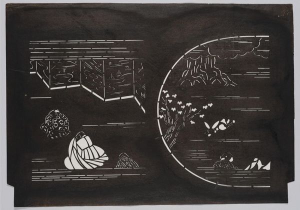 Editor: This is Serizawa Keisuke's "Stencil for Illustrated Don Quixote," a work that's strikingly graphic in its black and white contrast. What I find interesting is the collision of cultures—the iconic Spanish novel filtered through a Japanese artistic lens. What do you make of this cultural interplay? Curator: It's a fascinating dance, isn't it? Serizawa isn't just illustrating Cervantes; he's re-imagining him. The stark stencil technique, reminiscent of traditional Japanese prints, gives Don Quixote a whole new wardrobe, a new stage. Do you see how the familiar narrative bends and reshapes itself within this visual language? Editor: Absolutely, it's like a dream where different worlds meet. The stylized figures and landscapes become almost theatrical. I feel like I’m seeing Don Quixote for the first time. Curator: And that’s the magic of art, isn’t it? To defamiliarize, to awaken our vision. I feel like Serizawa has given us a new way to dream about old stories.