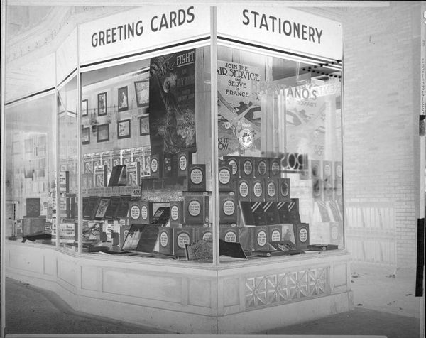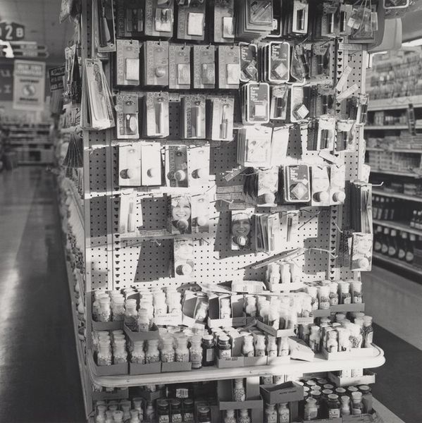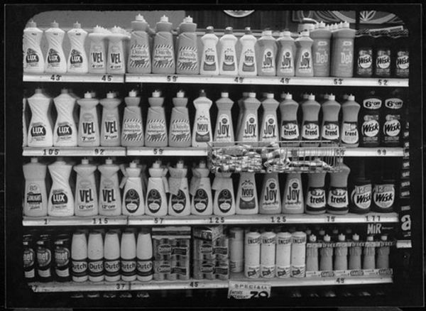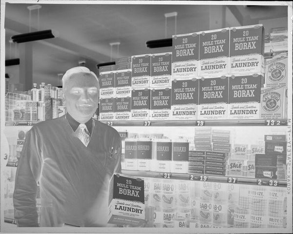 Editor: This photograph by Lucian and Mary Brown captures a detergent display, "Untitled ('Borax' detergent display)." What strikes me is the sheer repetition of the product; it feels almost oppressive. How do you interpret this seemingly simple image? Curator: The Browns’ photograph, beyond its surface, hints at the burgeoning consumer culture. Consider the post-war boom and how advertising played a role in shaping desires and norms, particularly for women in the domestic sphere. It provokes questions about labor, expectations, and even environmental impacts. Does it prompt you to consider similar issues? Editor: Yes, it makes me wonder about the performative aspect of cleanliness and the environmental consequences of mass consumption. Curator: Precisely. The image then becomes a quiet commentary on the social construction of cleanliness and the relentless cycle of consumerism. It's a mundane scene imbued with deeper, critical implications. Editor: I see that now. It’s interesting how a simple photograph can reveal so much about social and cultural values. Curator: Indeed. By understanding its historical moment, we unlock a powerful critique embedded within the ordinary.