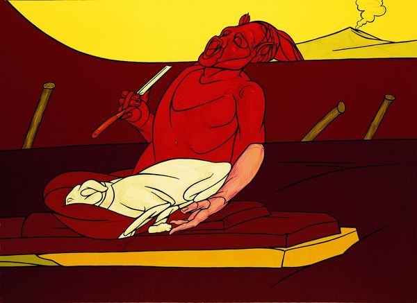 Valerio Adami's A Midsummer Night's Dream is, well, a dream! The artist’s clear, sharp outlines give it the feel of a graphic novel. It’s like he’s constructing an alternate reality, where color is laid down flat and shapes become simplified symbols. I love the tension between the smoothness of the surface and the cartoonish quality of the forms, particularly the exaggerated face of the figure. The juxtaposition of the colors, like the bold yellow ground against the deep red sky, creates a visual vibration, a subtle unease. The dog pulling at the man's leg; it feels like a direct tug on our attention. It makes me think of David Hockney, another artist who isn't afraid to use vibrant colors and flattened perspective to create his own world. Ultimately, it is this embrace of the strange and unexpected that makes art such a powerful tool for exploring the complexities of human experience.