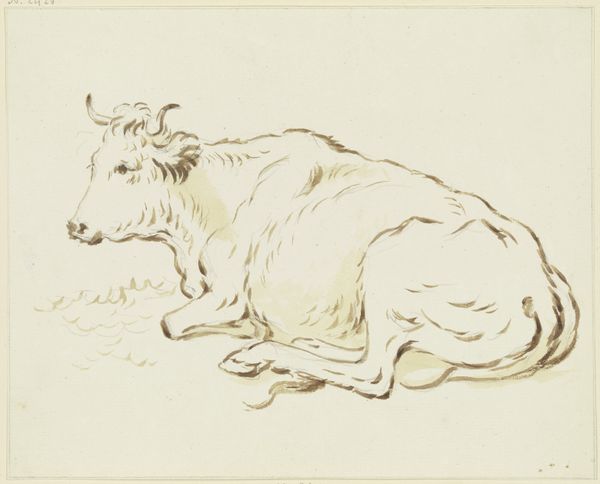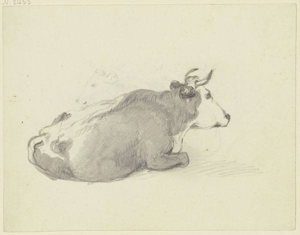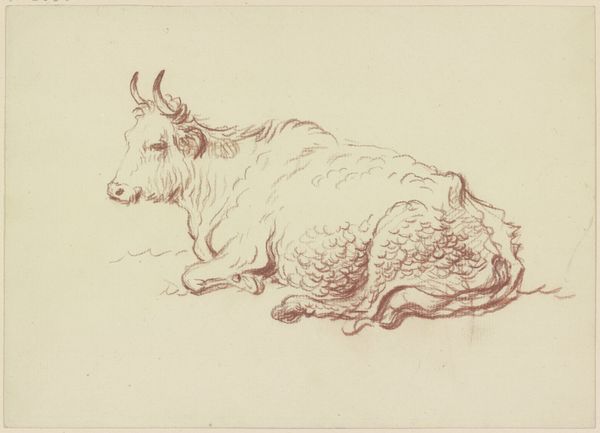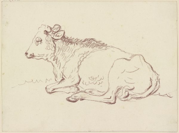 Editor: Here we have "Liegendes Rind nach rechts, mit leicht ge\u00f6ffnetem Maul" a drawing by Friedrich Wilhelm Hirt, currently housed in the St\u00e4del Museum. It appears to be executed in red chalk. It gives a really immediate, intimate feel, almost as though the artist just quickly sketched this resting cow. What aspects stand out to you most when you view this work? Curator: The immediacy you mention stems directly from the artist's deft handling of line and form. Observe the economy of means employed. Hirt uses line weight variation—thicker, darker strokes to define contours and suggest areas of shadow, juxtaposed with lighter, almost ephemeral lines to imply form and texture. Notice, particularly, how the musculature of the rear quarters is conveyed with just a few strokes of darker pigment. Do you see how that use of darker values causes our eye to interpret depth, lending a three-dimensionality to the form that belies the two-dimensional surface? Editor: Yes, absolutely! I also see how the overall composition draws your eye to the center of the animal. Curator: Indeed. Consider also the texture Hirt achieves through cross-hatching and stippling in certain areas, such as the flank of the cow, compared with the smoother application of chalk elsewhere. This interplay of textures enlivens the drawing, imbuing it with a vitality that transcends a mere representational likeness. This wasn't created just for accuracy; it suggests feeling, movement, a specific observation made manifest. Editor: So, focusing on the techniques employed by Hirt gives a richness to appreciating the drawing. Curator: Precisely! It's about decoding how Hirt's material and formal decisions coalesce to shape our viewing experience, revealing the artistic intention beyond mere subject matter. Close study helps decode the composition of the image and leads us to further inquiry about intention and artistic ability.
