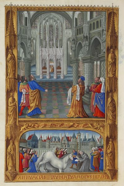 Editor: So, here we have "Paradise", a tempera painting that, according to what I could find, might be attributed to the Limbourg Brothers during the medieval period. It's incredibly detailed. All those figures crammed in! I am struck by how, despite the heavenly theme, it feels very grounded, almost earthly. What do you see in this piece? Curator: Grounded is an interesting choice of words! For me, miniatures like this often feel like windows into another world. Imagine the patron holding this book, suddenly transported to this vision of paradise. And paradise wasn't just fluffy clouds back then. It was a social hierarchy, neatly ordered, everyone knowing their place in the divine plan. Do you notice how carefully the Limbourg brothers render the different groups, from the angelic musicians at the bottom to Christ and the Virgin at the top? Editor: Yes! It’s all so precisely rendered. The level of detail must have been astounding at the time! So you're saying that even in paradise, there's still a structure, a class system, perhaps? Curator: Precisely! Though hopefully with better real estate. And a harp, naturally. It makes you wonder, doesn’t it? If we were to imagine our own paradise today, what would it look like? What objects would we include, what kind of order - or disorder - would we want to create? Editor: That’s an interesting thought. It definitely would be a very different scene today! Thinking about it that way brings it all into a whole new perspective for me. Curator: Exactly! That's the magic, isn't it? To make those old paradises speak to our own ideas of what paradise could, or perhaps should, be.