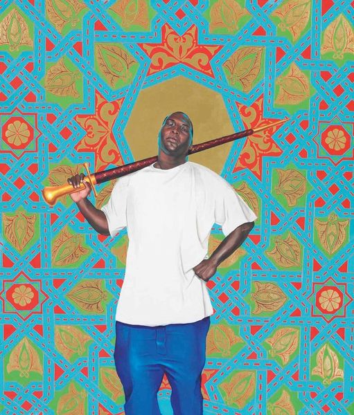 Editor: This is "David Lyon" painted by Kehinde Wiley in 2013. It’s quite striking, the way the figure just pops against the busy floral background. What are your thoughts? What do you see when you look at this piece? Art Historian: Oh, I see a symphony! Wiley always gets me going; he remixes historical portraiture with contemporary Black figures, drenching it all in flamboyant patterns. It’s a total power move! It’s like he’s asking: who gets to be immortalized, who gets to be ‘art’? And, crucially, what kind of fabulous wallpaper do they get? What do you think of his choices, mixing the 'street' with these grand, almost royal poses? Editor: I hadn't really thought of it as challenging that whole 'who gets to be art' idea... I guess I just thought it was cool. But the patterns kind of distract me. Art Historian: Distract you, huh? Interesting! See, for me, that’s the point where the magic happens! Those patterns are borrowed from textiles, often with specific cultural significance. So it is about history. David, in his modern streetwear, becomes this regal figure WITHIN that history. Doesn’t that give the whole thing a new spin? Like, a 'king for a day' kind of thing? Editor: That makes more sense! I get that regal feeling now. I guess I was too focused on the surface and missed the layers underneath. Art Historian: That's the fun part about art, right? Keep digging, keep questioning! You'll find a whole new world down there. Never settle only for 'cool'. Always ask 'why cool'?