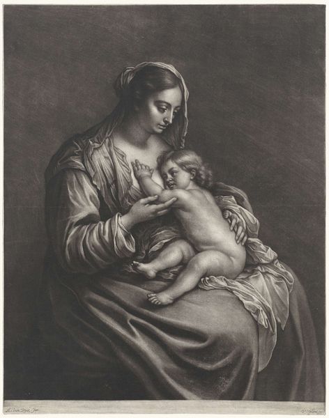 Curator: Here we have "Maria aanbidt het Christuskind," or "Mary Adoring the Christ Child," an engraving that exists somewhere between 1659 and 1740, attributed to Jan van der Bruggen. Editor: Oh, what a gentle image. It’s imbued with such tenderness. Mary looks on her son with her hands clasped in what looks like a prayer, but is perhaps just the utter awe of new motherhood. I feel enveloped in that tender maternal mood. Curator: The devotional scene is certainly striking. Given it's an engraving, let's consider the production process. An image like this would have circulated widely, becoming accessible to a broad audience beyond the wealthy elite who might commission original paintings. We can analyze the availability of paper, the engraver's skill, and the economics of printmaking at the time. Was this intended for personal devotion, or mass distribution to inspire faith, or profit? The small changes of medium create a huge contextual difference! Editor: It makes me wonder about Van der Bruggen’s own relationship to faith and motherhood. Was this a commissioned piece? Was he grappling with these themes in his own life? It feels very personal, not formulaic at all, even though the image is a recognizable religious scene. Curator: I think that touches on an important point about these prints. They become objects of both personal meaning and widespread cultural significance. The texture and contrast in the print, for example, draw our eye. It's important to think about how the engraver’s work facilitates a connection for the viewer. Editor: Absolutely! Art becomes this bridge. Looking at it, I see not just the historical representation but a timeless depiction of motherly love. The darks and lights make for an almost spotlight effect, highlighting the holy moment between the mother and child. A quiet kind of awe. Curator: So, considering it all together, the material and method of print production intertwine with the devotional sentiment represented in "Maria aanbidt het Christuskind.” A truly rich artwork, on many levels. Editor: A gentle, spiritual, human touch immortalized and distributed. Lovely.