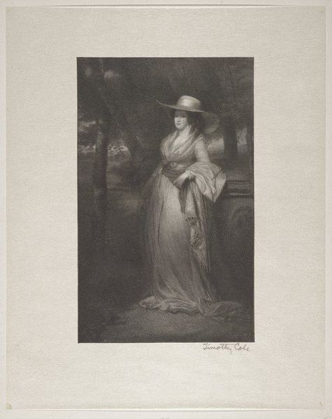 Curator: Welcome. Here we have "Georgiana, Duchess of Devonshire," a print crafted in 1780 by Valentine Green, now residing at The Art Institute of Chicago. What strikes you most about it at first glance? Editor: The sheer drama of it! The composition, with Georgiana positioned slightly above the viewer on what looks like a garden staircase, creates a feeling of poised power. The contrast is also amazing, from the lush black foliage of the background trees to the pearly glow of her gown, the feathers and height of the hair and the set design really tells of her importance. Curator: Absolutely. Prints like this played a crucial role in shaping public perception, especially of powerful women like Georgiana. Consider the Duchess's role in the Whig party – this image served as a form of political branding, aligning her with notions of elegance and aristocratic authority. Editor: So it is a form of propaganda? A carefully constructed visual argument for her political and social sway. Curator: Precisely. Her very presence at political events and the dissemination of her image were carefully managed to influence public opinion, solidifying her place within the Whig social network. What's so interesting to me is how the print circulated throughout society, acting almost as a prototype meme. Editor: Interesting... looking through today's lens, Georgiana's style speaks of the excesses of aristocracy and the rigid conventions in court and culture, where female identity was defined by appearance. A counter narrative would explore her exploitation and the limited scope she had to be seen outside her image. Curator: A point very well-made! Though celebrated for her beauty and fashion, we need to consider the limitations placed on her. As you’ve shown, a twenty-first century perspective demands interrogation into themes of power, control and representation within portraiture of this era. Editor: Agreed. Examining it more deeply provides rich possibilities for conversations around representation. Curator: Indeed. I am forever in awe of the complex historical narratives that come together in a single piece of art.