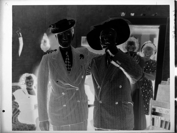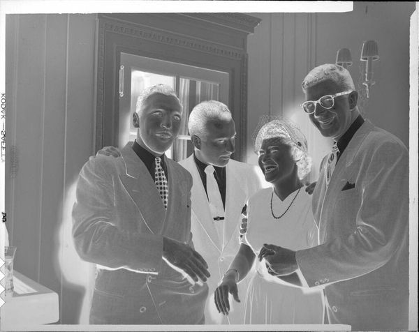 Editor: This is an untitled photo by Martin Schweig of two couples posing in a living room at a Christmas party. The image is a photographic negative. It has such an interesting tonal range. What can you tell me about it? Curator: Note the stark contrast between the figures and the background. The negative effect emphasizes shape and form, abstracting the scene. Observe how the composition directs the eye. Editor: So, the composition, more than the context, is what defines the image for you? Curator: Precisely. The formal elements create a visual language independent of the subject matter. The relationship between light and dark, positive and negative space, becomes the primary focus. Editor: I'm starting to see it now, it's a study in contrasts. Thanks! Curator: Indeed. And that focus reveals the photographer's formal concerns.