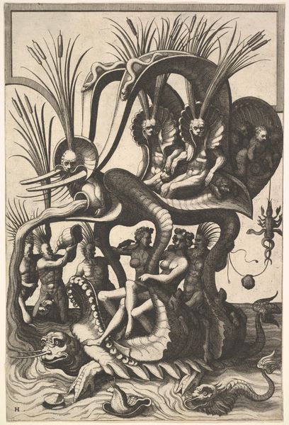 Editor: So, this is Domenico Beccafumi’s "The Sea Gods," made with etching and engraving. It feels like a fever dream! All these fantastical creatures and the almost obsessive detail in the linework. What can you tell me about this piece? Curator: This print certainly presents an opportunity to explore the materiality of art production during the Mannerist period. Look closely at the dense cross-hatching, the way Beccafumi layered the etching and engraving. Think about the labor involved, the repetitive, almost meditative process of creating such intricate detail using metal plates. Does this attention to material detail change your initial interpretation of its "fever dream" quality? Editor: Well, knowing it's a print and thinking about the process definitely grounds it a bit more. It's less about pure fantasy and more about the skill and technique required. It makes me wonder who this print was made for? Was it for mass consumption, or a more elite audience? Curator: Exactly. The question of audience is key. The production of prints like these served multiple functions. Yes, it allowed for the dissemination of imagery to a wider audience, creating a market for art beyond unique paintings or sculptures accessible only to the wealthy. But consider, too, the skilled labor that would have been needed and who controlled that labor. Are the themes entirely 'elite' or were there middle-class buyers for prints such as this? Editor: That's a great point. So, the material aspect isn't just about the artistic process, but the whole economic and social context of its making. Thinking about the commerce of prints is new to me! Curator: Precisely! And by examining the materials and process, we move beyond just aesthetic appreciation and get closer to understanding the artwork’s place in its time. The "Sea Gods" becomes a document reflecting the technologies, economies, and social structures of the era. Editor: This completely changed how I'm seeing it now! Thanks for walking me through it.
